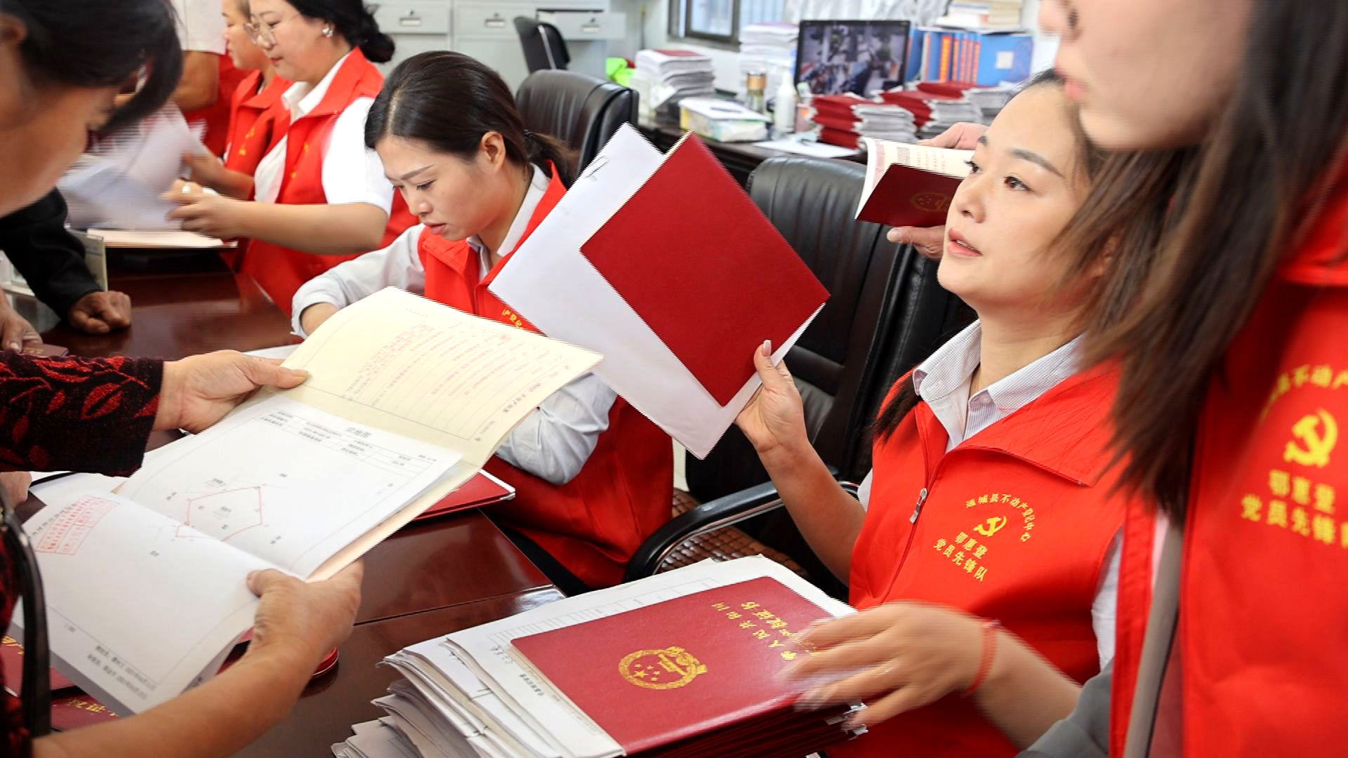 通城县不动产登记中心负责人 郭文辉:国庆假期,通城县不动产登记中心党员先锋队来到麦市镇陈塅村,把专业的服务窗口搬到群众的家门口,为群众送来房地一体的不动产权证书,现场颁证565本。