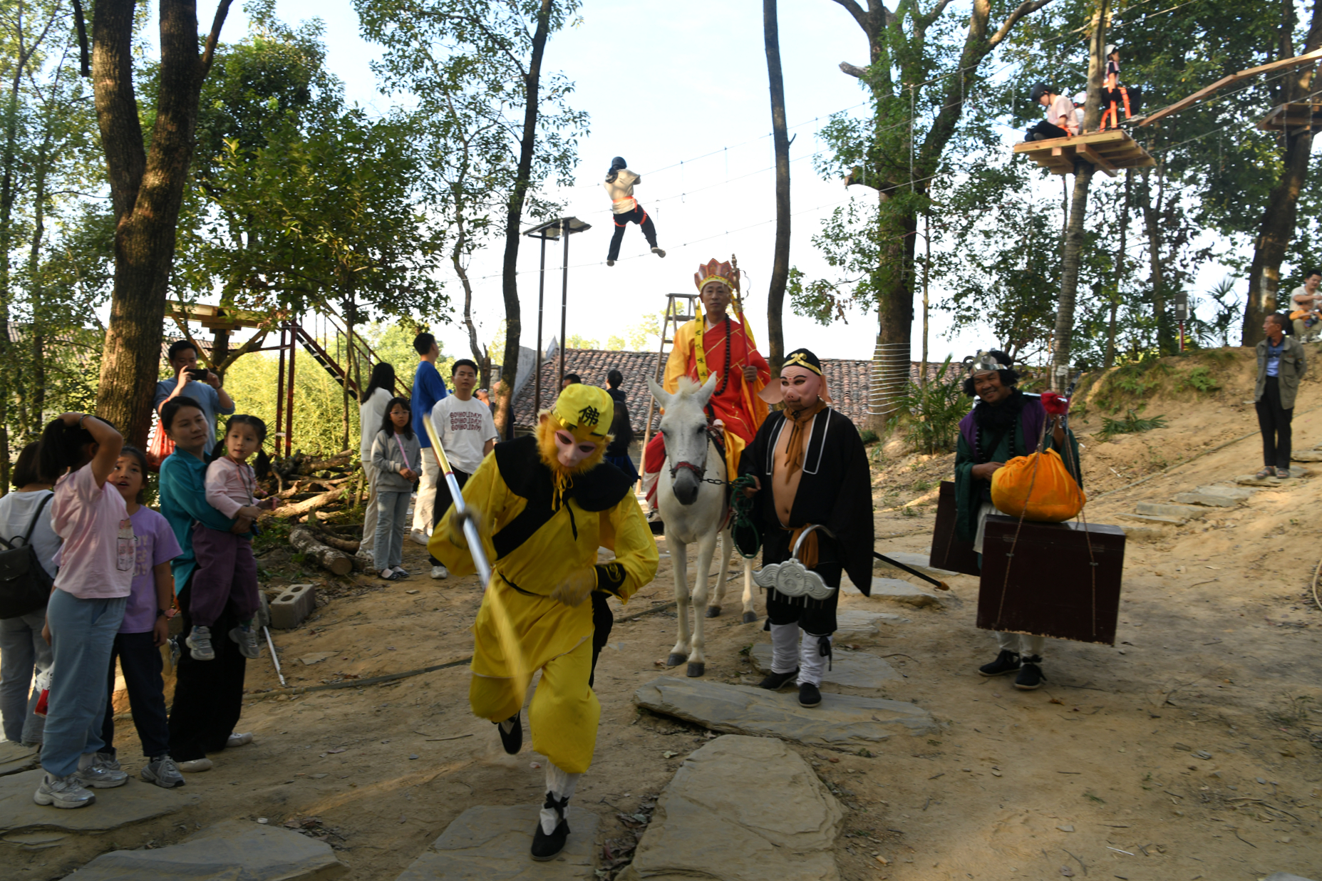 2024年10月4日,在湖北省咸宁市通城县关刀镇高冲村景区,游客观看西游记表演。