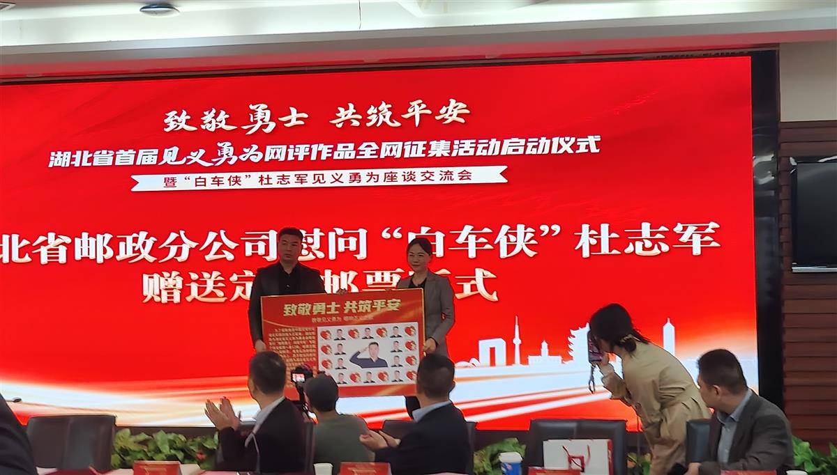 该邮票由湖北邮政与省见义勇为基金会联合发行,一套12枚,邮票主图为爱心和鲜花,寓意弘扬崇德向善、昂扬向上、勇于担当的良好社会风尚,副图为“白车侠”肖像。