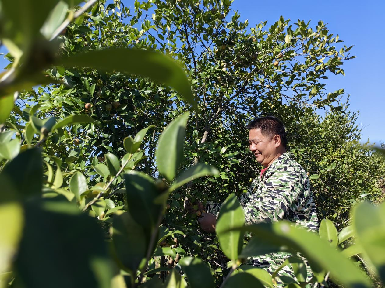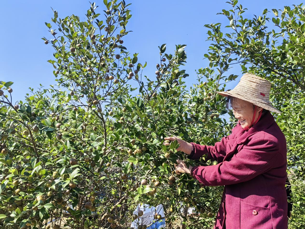 “自从村里搞了这个油茶基地,每年采摘季我都会过来这边做点零工”,黎婆婆边采油茶果边向我们介绍,“这个老板是咱们本村的党员,看我们这些老人家闲着在家里,就把我们喊着来做工,不仅给工钱中午还管饭,我们也都乐意来,做多做少总是个钱。”