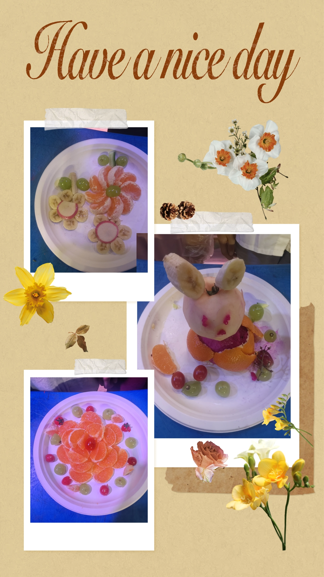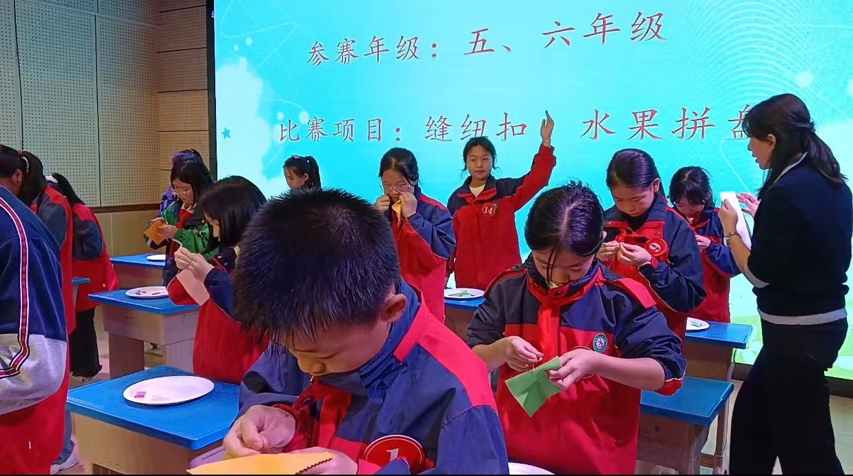 五、六年级的大哥哥大姐姐们进行的是缝纽扣和水果拼盘项目。缝纽扣时,同学们穿针引线,纽扣在他们手中稳稳地被缝到布片上,那专注的眼神仿佛一个个小裁缝。水果拼盘项目更是创意无限,同学们发挥自己的想象力,将各种水果巧妙地组合在一起,呈现出一个个精美的水果拼盘作品,有的像美丽的花朵,有的像可爱的小动物。