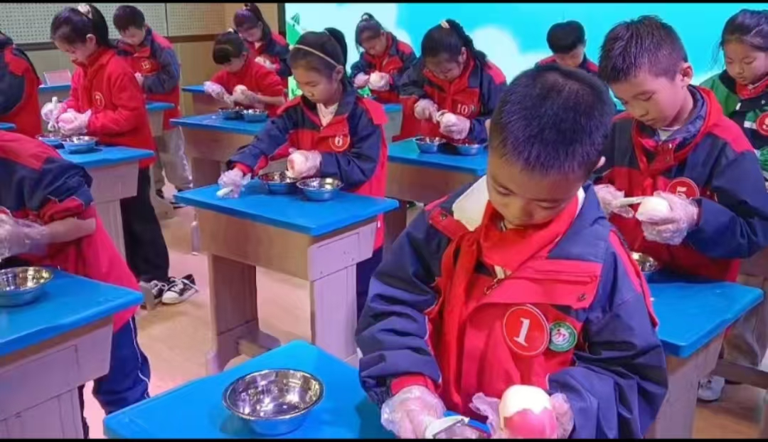 三、四年级的同学们则迎来了系鞋带和削苹果的挑战。系鞋带项目考验着同学们的动手能力和细心程度,同学们双手熟练地穿梭在鞋带之间,很快就系出一个个漂亮的蝴蝶结。削苹果项目中,孩子们一手拿着苹果,一手握着瓜刨刀,小心翼翼地刨着,不一会儿,一个个光滑的苹果就出现在眼前。