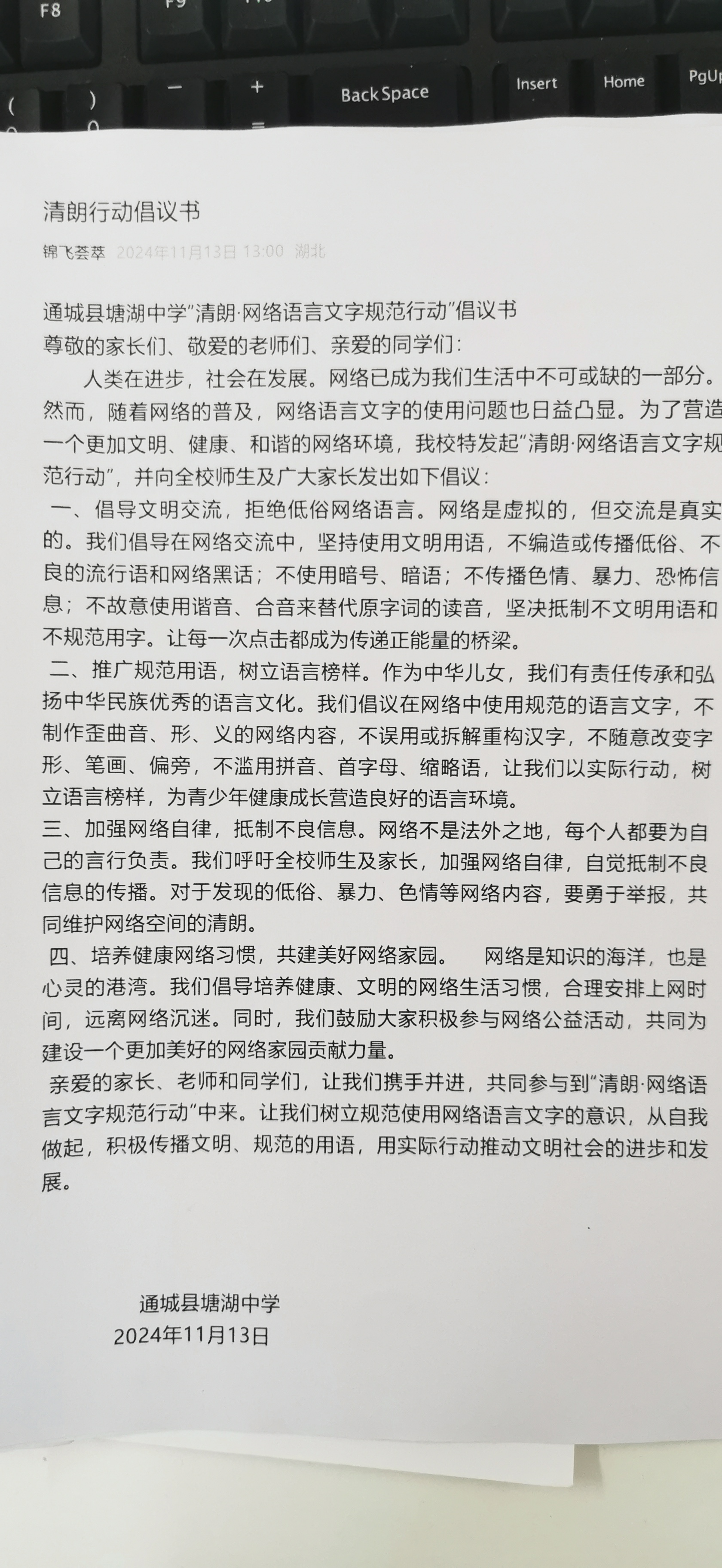 【通讯员 汪锦飞】语言文字是中华文化传承的重要载体,是民族团结和社会进步的重要基石。为引导全体师生树立正确的语言文字观,通城县塘湖镇塘湖中学于11月12日至15日开展了“清朗·规范网络语言文字使用”系列活动。