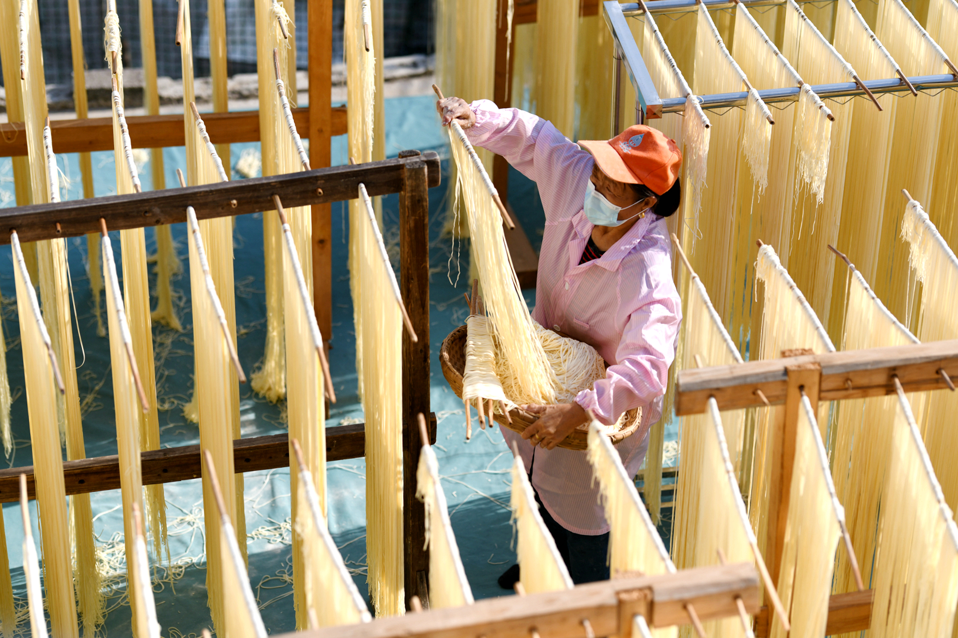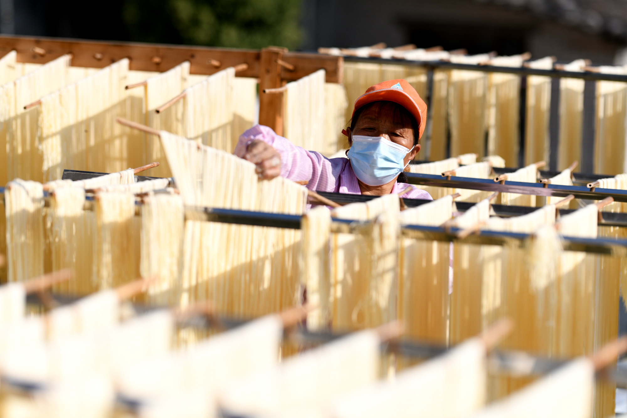 【通讯员 刘建平 沈威】11月14日,通城县五里镇左港村脱贫户胡国平的妻子在加工、晾晒面条。