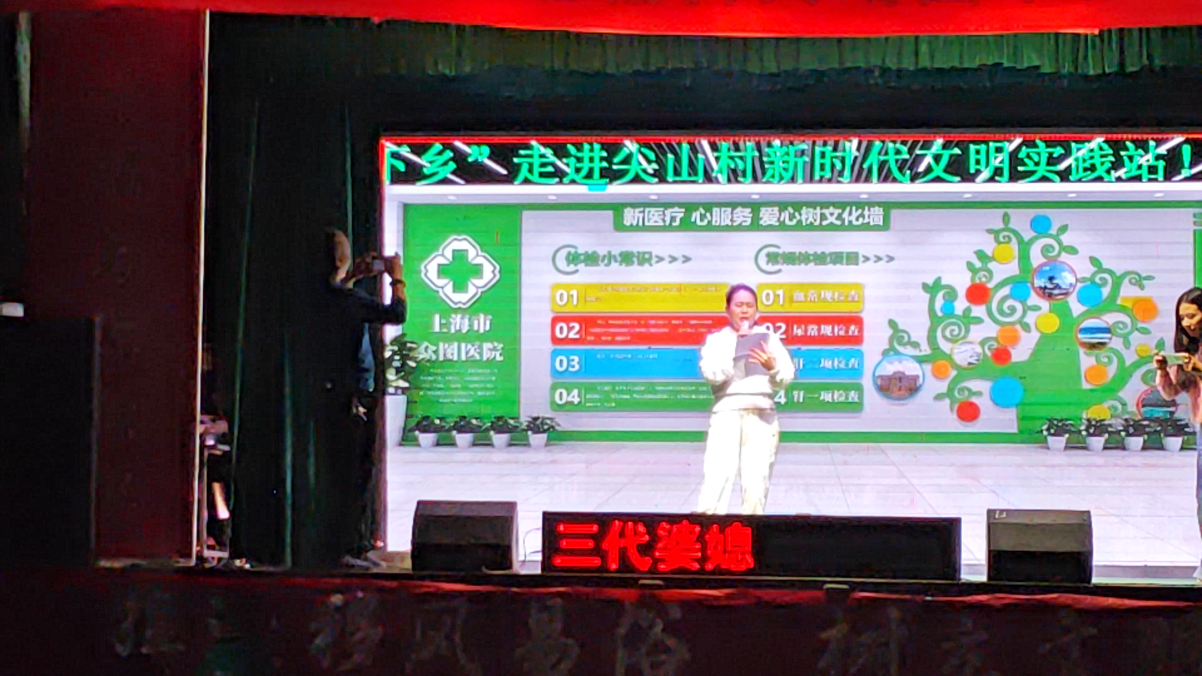 剧团先后表演了现代小品《依靠》和地方花鼓戏《三代婆媳》。《依靠》通过现代生活中生动有趣的片段,反映了医保政策和缴纳医保的好处,让村民们领悟到医保对于个体和家庭生活的重要保障作用。《三代婆媳》围绕一家三代婆媳之间产生的摩擦与矛盾的解决,传播了中华传统孝道文化,展现了新中国成立以来在农村移风易俗工作的推进、为农民思想带来的翻天覆地之变。