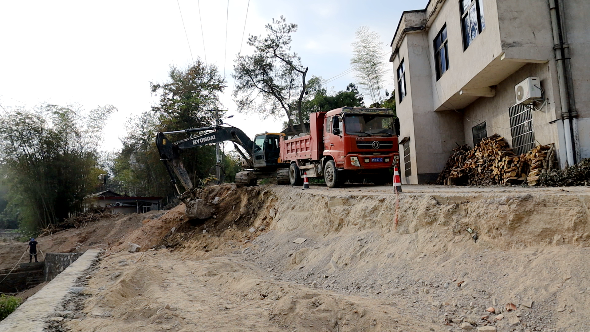 近日,在通城县大坪乡大九房村五组邓家屋场的村级道路上,挖掘机正在挖土平地,施工现场一片繁忙。