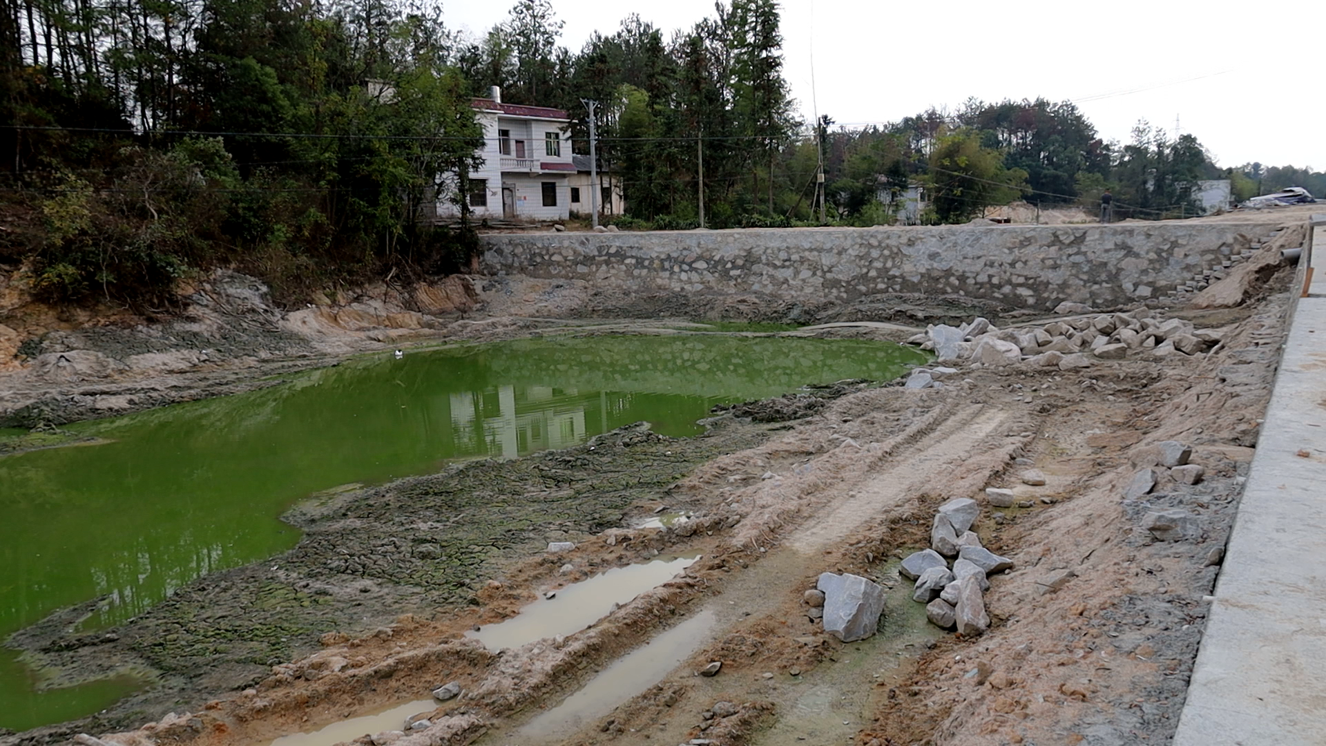 通城县大坪乡大九房村施工负责人 李志:目前,屋场三口鱼塘的其中两口鱼塘,石方已完工,下一步再进行清理淤泥、蓄水,即可完工。
