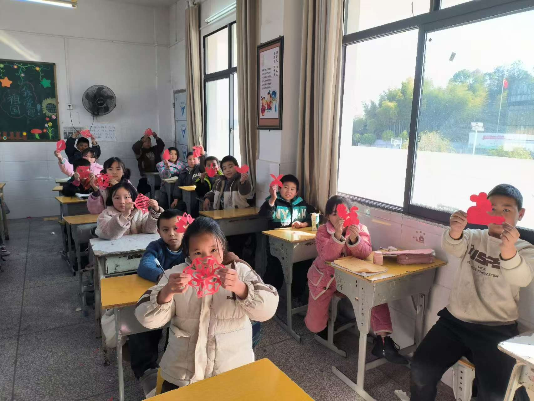 除了写“福”字,还有巧手剪纸。孩子们兴奋地挥动剪刀,在老师的指导下初试剪纸,每一次剪刀落下都代表着对传统文化的一次探寻和认知。剪纸吸引了许多学生的剪纸兴趣,他们学习如何将一张平平无奇的纸张,通过巧妙的设计和精准的剪切,转化为一张张充满童真的剪纸作品,记录着孩子们的成长。