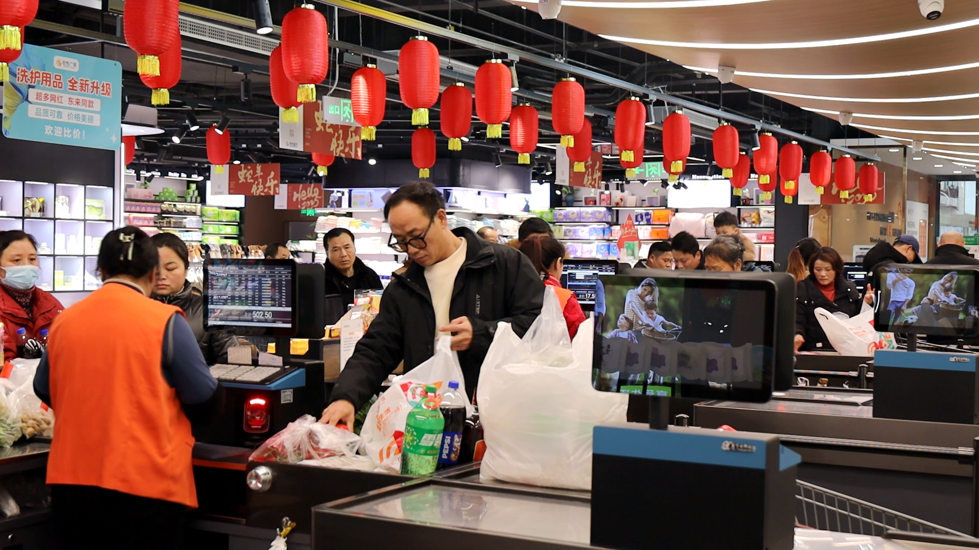 除了餐饮和游玩,为吸引客流,各大商场纷纷打造“年味+”消费场景。走进拾悦超市和家联超市,浓厚的年味扑面而来。年货产品被精心摆放在入口处、走廊里等显眼的位置,生鲜果蔬、米面粮油及各类奶制品、肉类产品等生活必需品摆放得井井有条,不少消费者正在挑选自己所需产品。