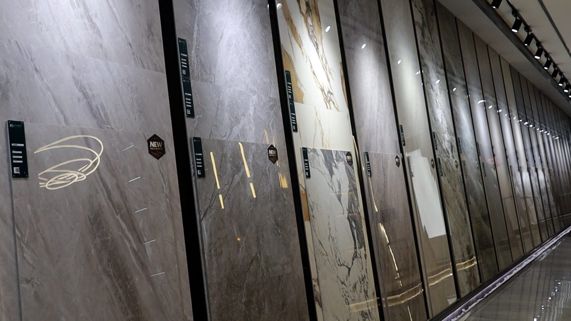 “纯平釉”系列产品采用金刚分子纯平釉、真彩臻石发色釉、超白胚底釉三层叠加技术,在釉料中熔入10%刚玉耐磨介质,再通过8000余转三道抛光,釉面更平整,花色更立体,瓷砖更坚硬。