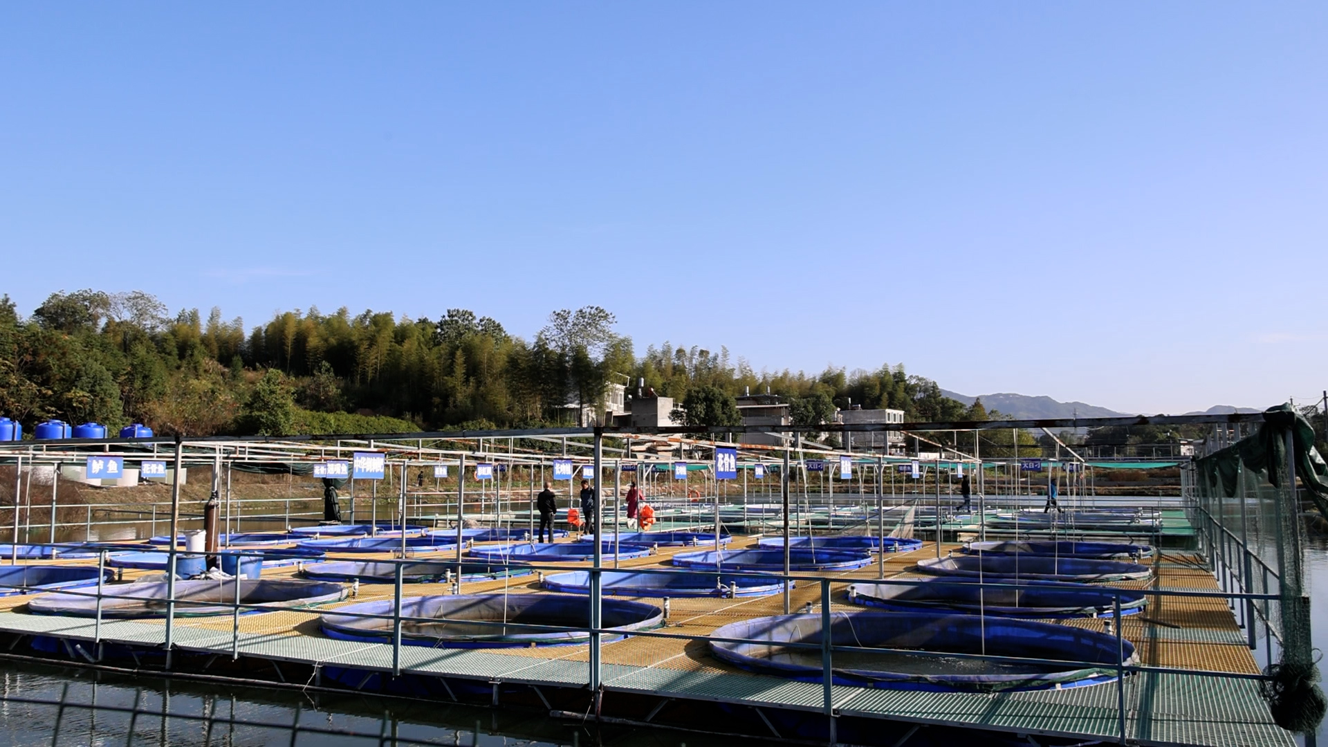 在五里村的池塘“零排放”圈养高密度水产养殖基地,一个个大型圆形圈养桶格外显眼,正在生长的鱼儿活蹦乱跳。