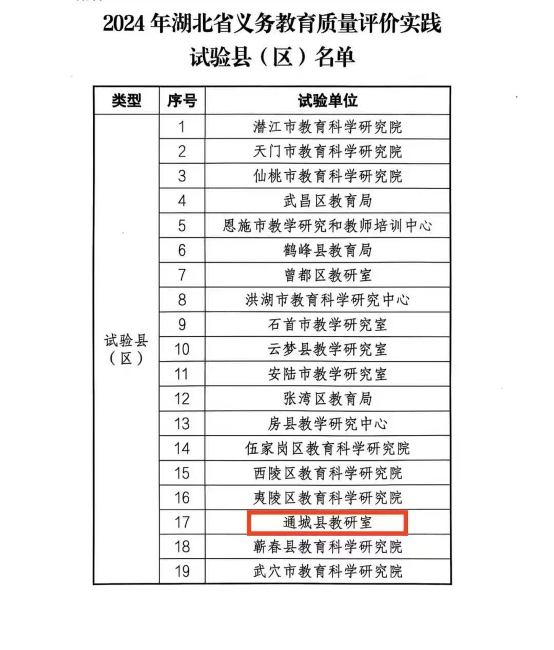 【全媒体记者 戴唯玮】近日,湖北省教育科学研究院公布了2024年湖北省义务教育质量评价实践试验基地名单,通城县入选“2024年湖北省义务教育质量评价实践试验县(区)”名单。