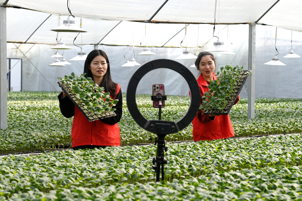 2025年2月27日,在湖北省咸宁市通城县北港镇绿康种苗基地温室大棚内,员工网上直播销售瓜苗,为春耕春播提供优质种源。