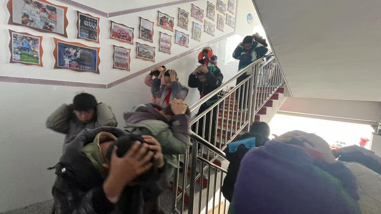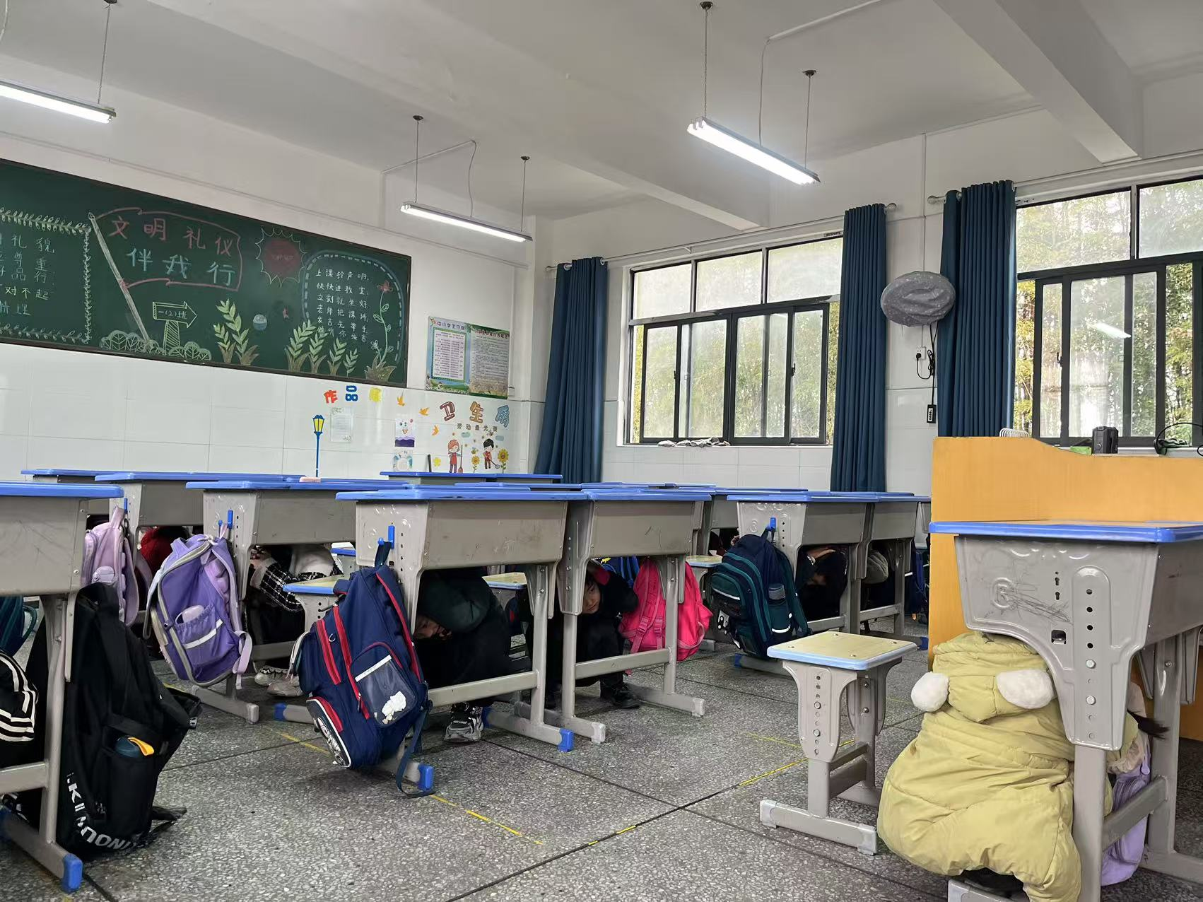 上午9点50分,急促的警报声响起,老师们迅速反应,大声呼喊着指导同学们:“快躲到课桌下!”同学们迅速钻到课桌底下,蜷缩身体,双手紧紧护住头部。