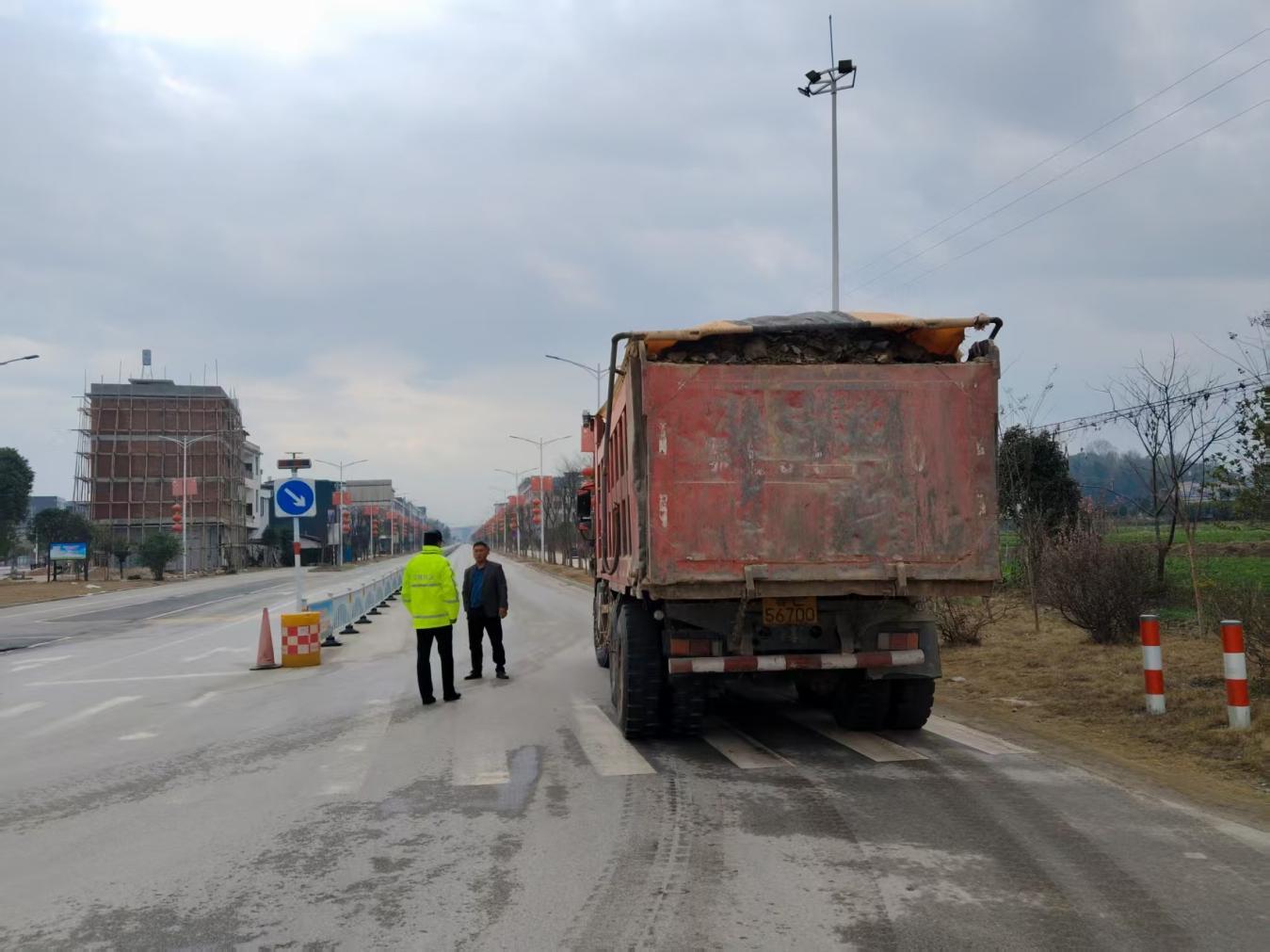 行动中,一辆满载货物的红色自卸货车被执法人员拦下检查,现场对其运输合规性等情况进行核验。执法人员还对道路周边环境进行巡查,纠正占道经营、乱停乱放等不良现象,维护道路通行秩序。