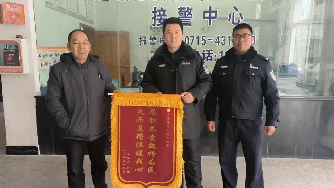 “谢谢警察同志,帮我家小孩找回了遗失的电话手表!”2月22日下午,辖区居民李爹爹将一面印有“尽职尽责热情为民,失而复得温暖我心”的锦旗送至五里派出所民警手中以表示感谢。