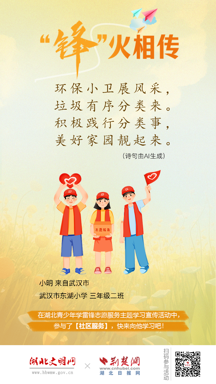 2025年3月5日是第62个全国“学雷锋纪念日”,根据中央文明办关于“扣好人生第一粒扣子”主题教育实践活动的部署要求,为引导全省未成年人积极开展学雷锋活动,传承弘扬雷锋精神,省文明办联合团省委、省少工委在今年学雷锋纪念日期间,组织未成年人开展“锋”火相传——湖北青少年学雷锋志愿服务主题学习宣传活动。