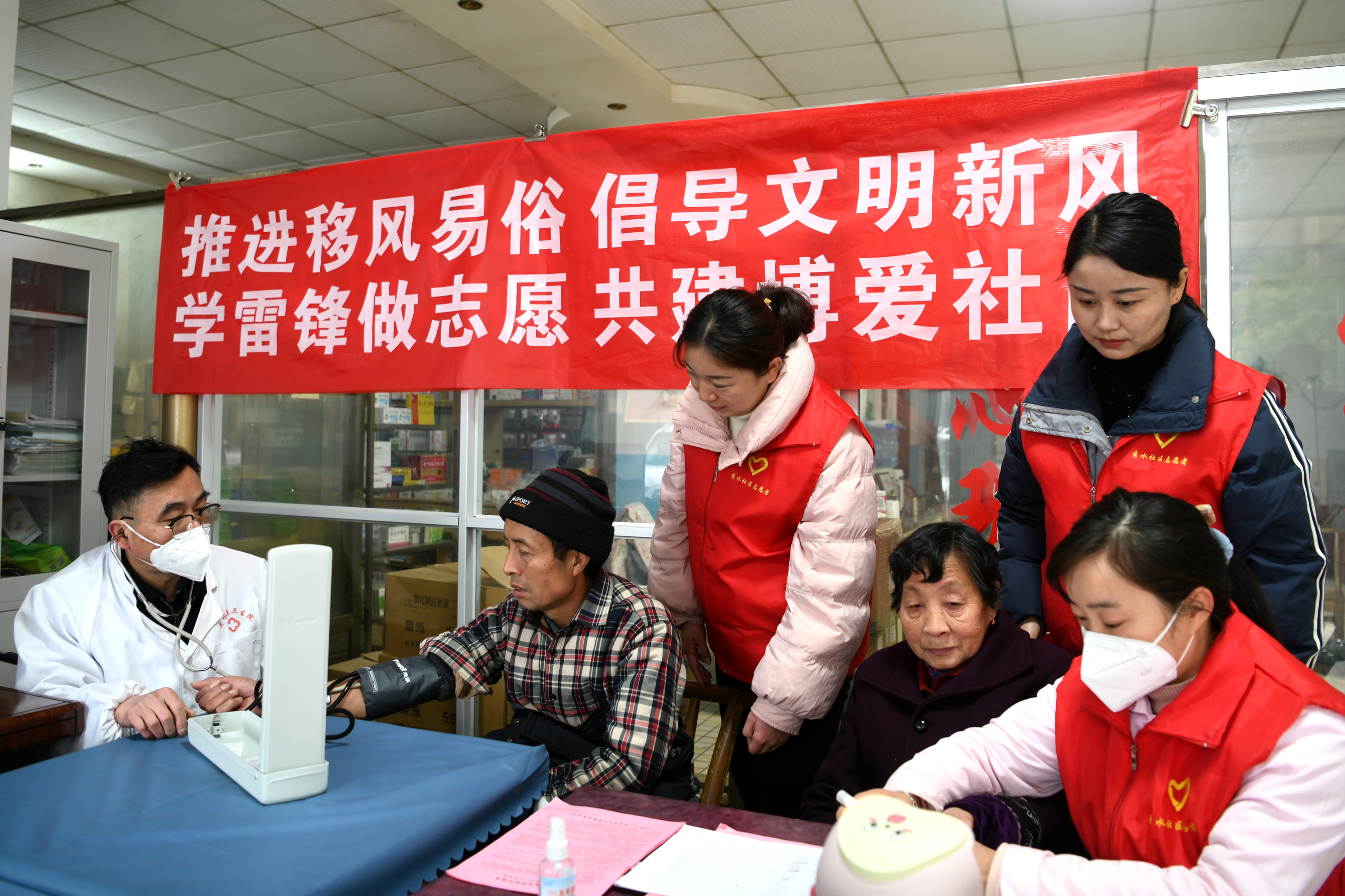 在湖北省咸宁市通城县隽水镇银山广场,志愿者积极献血,奉献爱心,用实际行动弘扬雷锋精神。