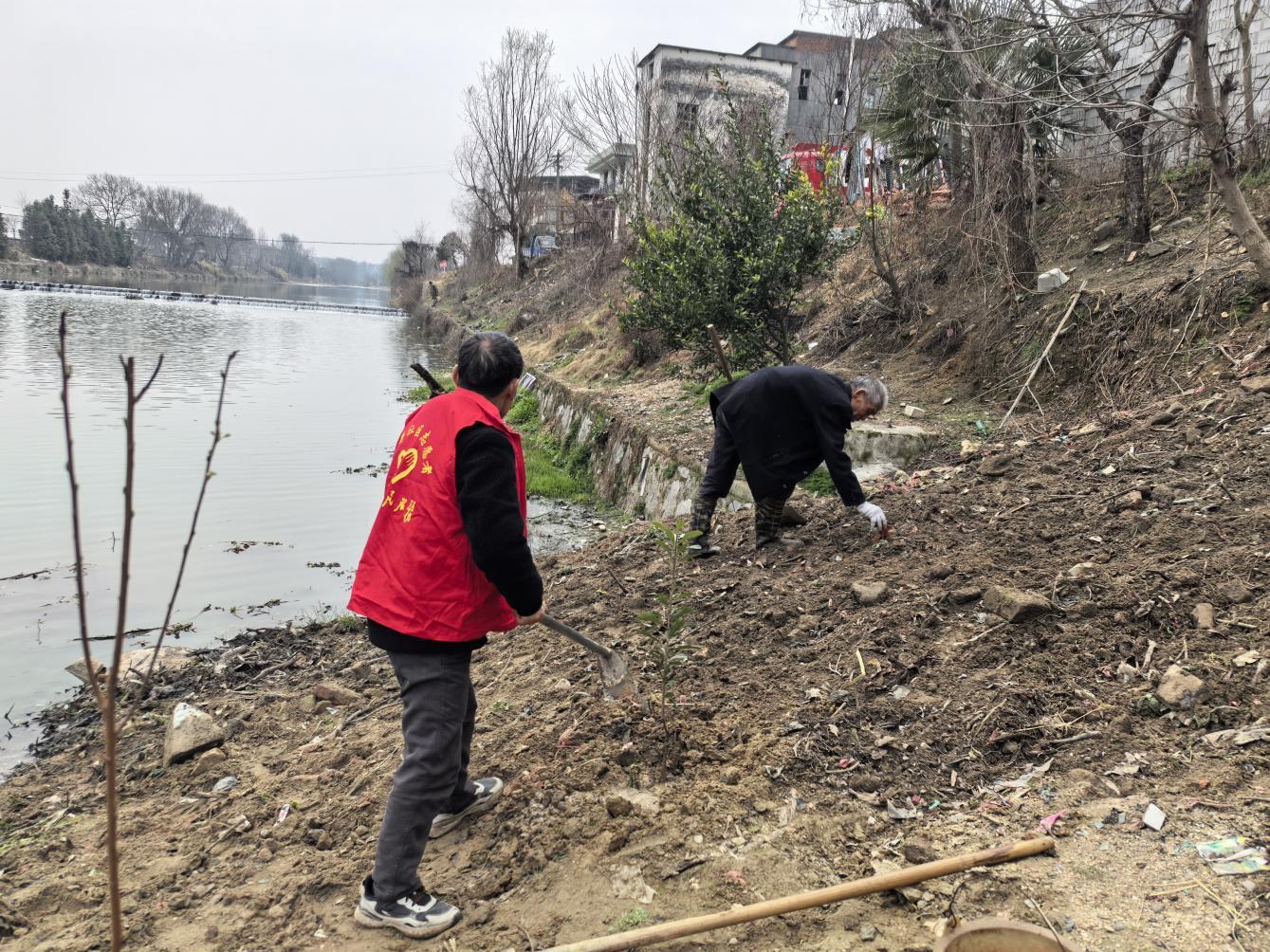 活动地点位于社区附近河畔。活动开始,实践站工作人员简要介绍了植树的步骤和要点后,志愿者们迅速行动起来。身穿红马甲的他们,热情高涨,干劲十足。大家两人一组、三人一队,分工协作。有人手持铁锹,奋力铲土挖坑;有人小心翼翼地扶正树苗,确保其笔直挺立。
