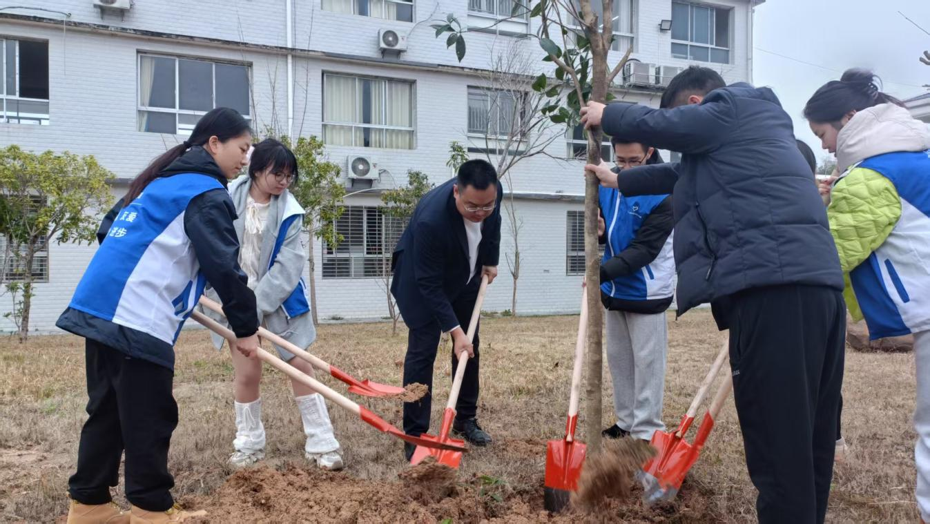 仪式结束后,中交二航局引青济隽项目部的员工代表与四庄中学的师生们迅速投入到热火朝天的植树活动中。大家分工明确,各司其职,从挥锹铲土到扶苗填坑,再到浇水灌溉,每一个步骤都严谨细致,现场呈现出一派繁忙而有序的景象。经过一番辛勤的努力,一棵棵嫩绿的树苗在春风中傲然挺立,为初春的校园平添了几分勃勃生机。