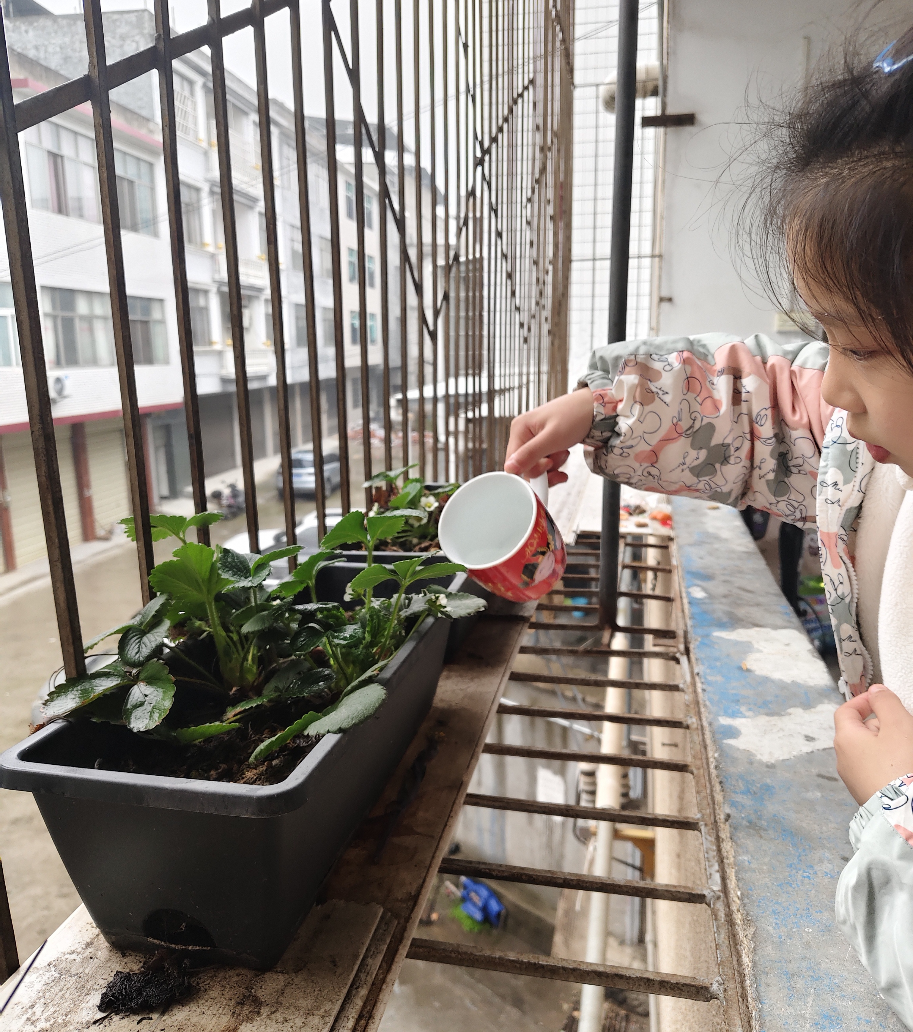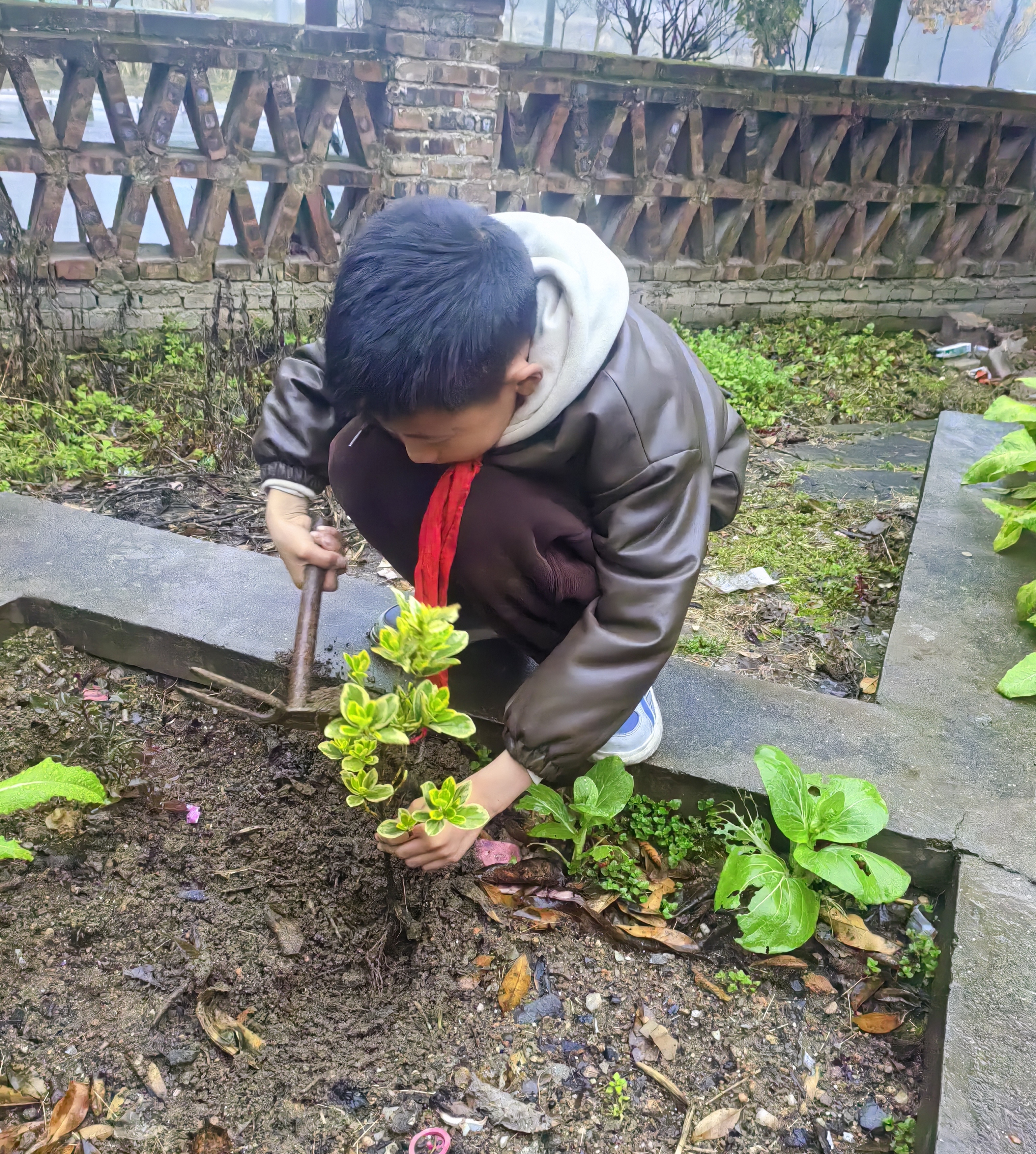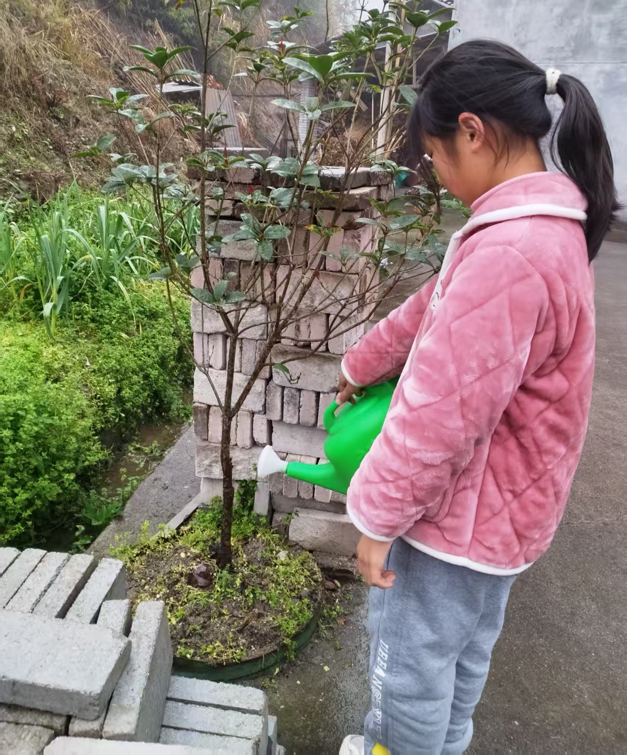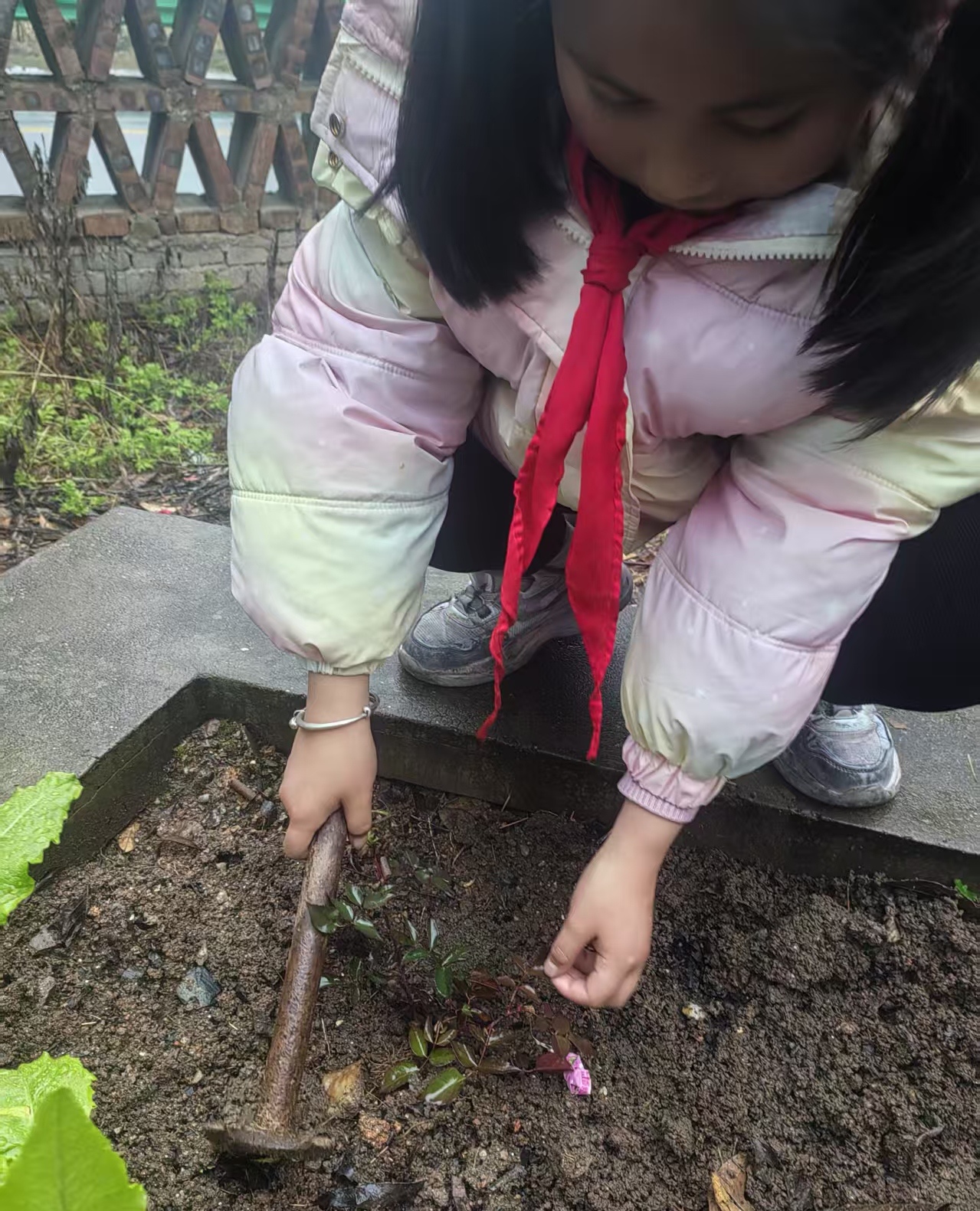 第二阶段由学生在家完成。有的学生在自家阳台种下多肉、花草等植物,用小铲子精心培土,再轻轻浇上适量的水,期待着它们茁壮成长;有的在庭院中种下小树苗,与家长一起挖坑、扶苗、填土,忙得热火朝天,看着亲手种下的树苗在春风中挺立,眼中满是憧憬。