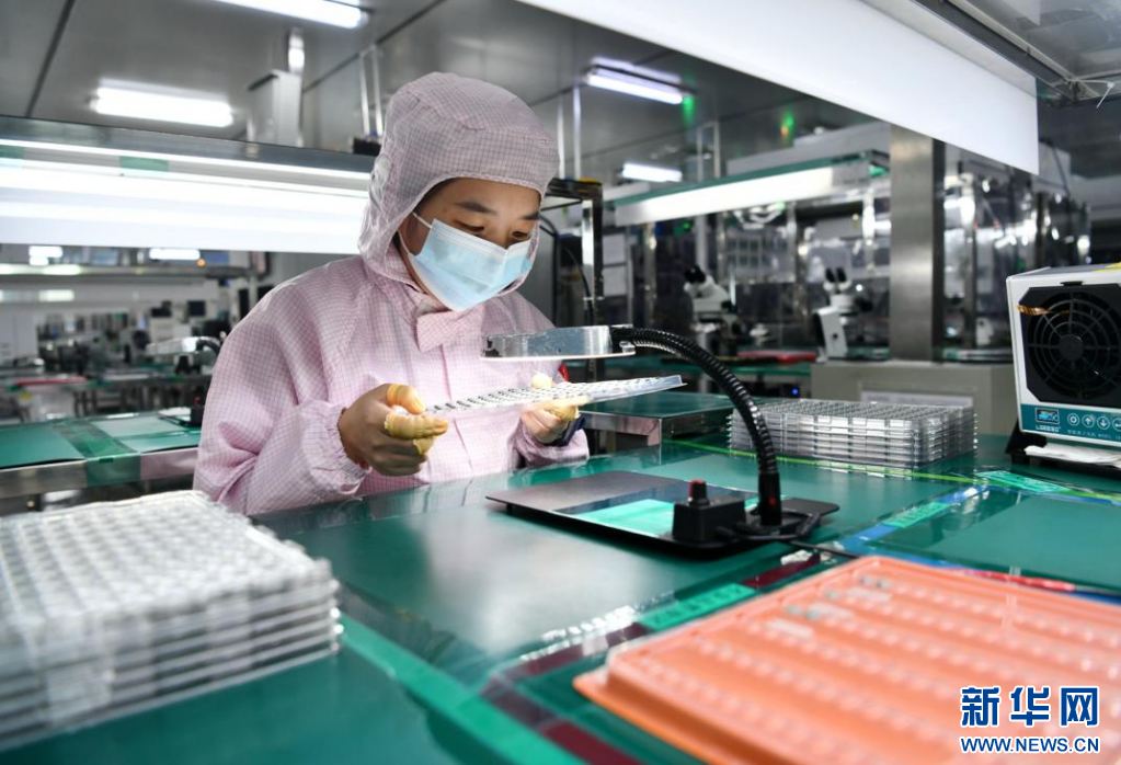 图为湖北三赢兴光电科技股份有限公司员工在检测产品质量。新华网发 刘建平摄