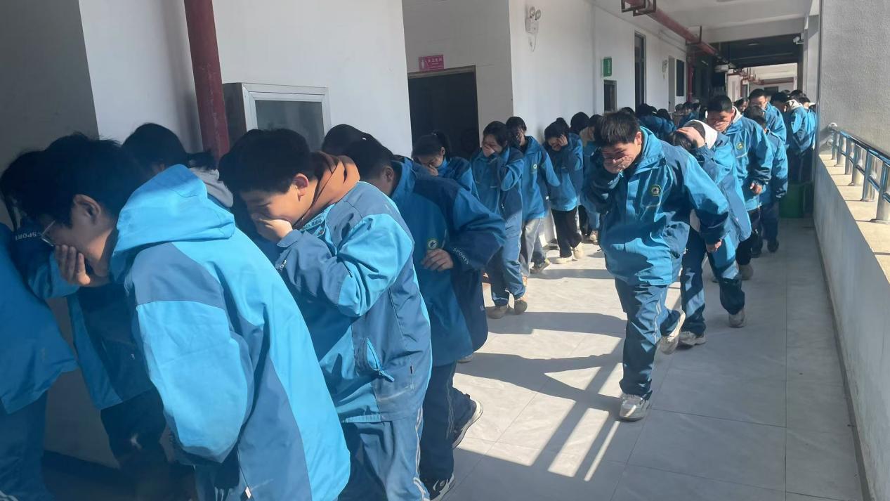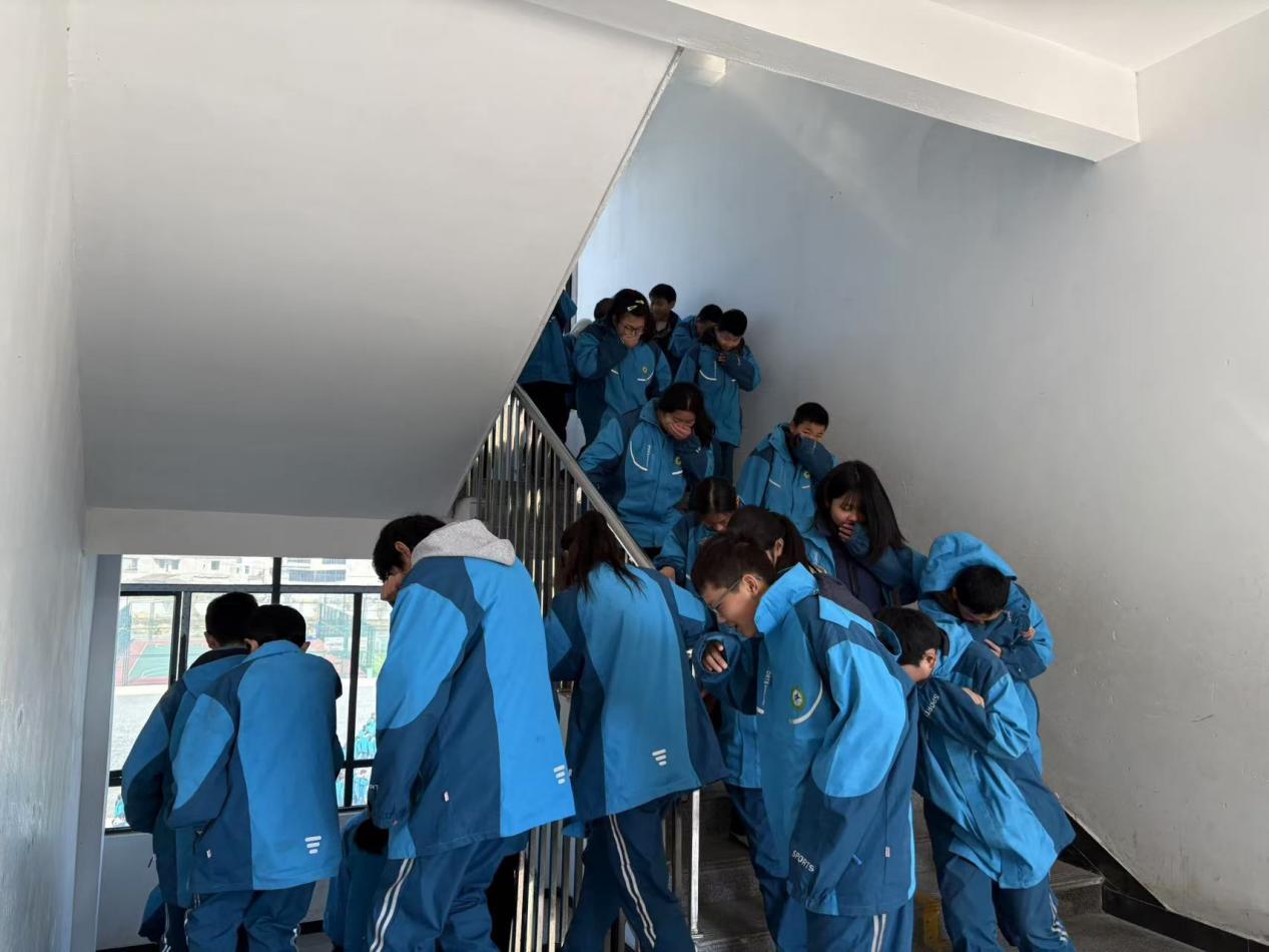 随着警报声响起,各班学生在班主任指挥下迅速用手护住头部,捂住口鼻,弯腰沿预定路线撤离。楼道值守教师严格把控分流节奏,确保小楼梯、大楼梯及备用通道畅通无阻,全体师生安全抵达操场并完成人数清点。