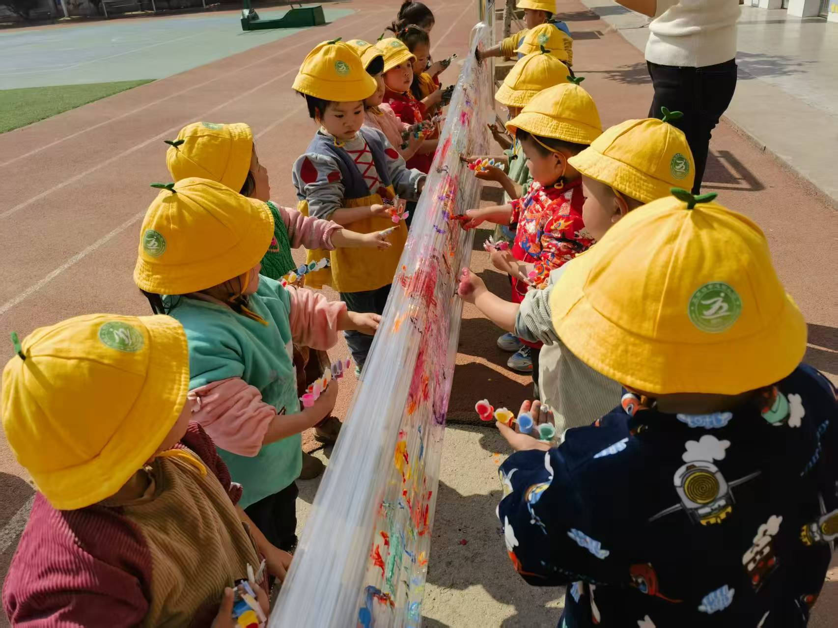 活动中,小班的小朋友们开启了“魔法春天”之旅。在老师的引导下,孩子们用稚嫩的小手,蘸取五彩斑斓的颜料,在保鲜膜上自由涂抹、尽情创作。不一会儿,一幅幅充满想象力的春日画作便呈现出来,有嫩绿的草地、五彩的花朵、湛蓝的天空……孩子们透过保鲜膜,好奇地观察着这个被“膜法”装点的春天,眼中闪烁着惊喜与兴奋的光芒。