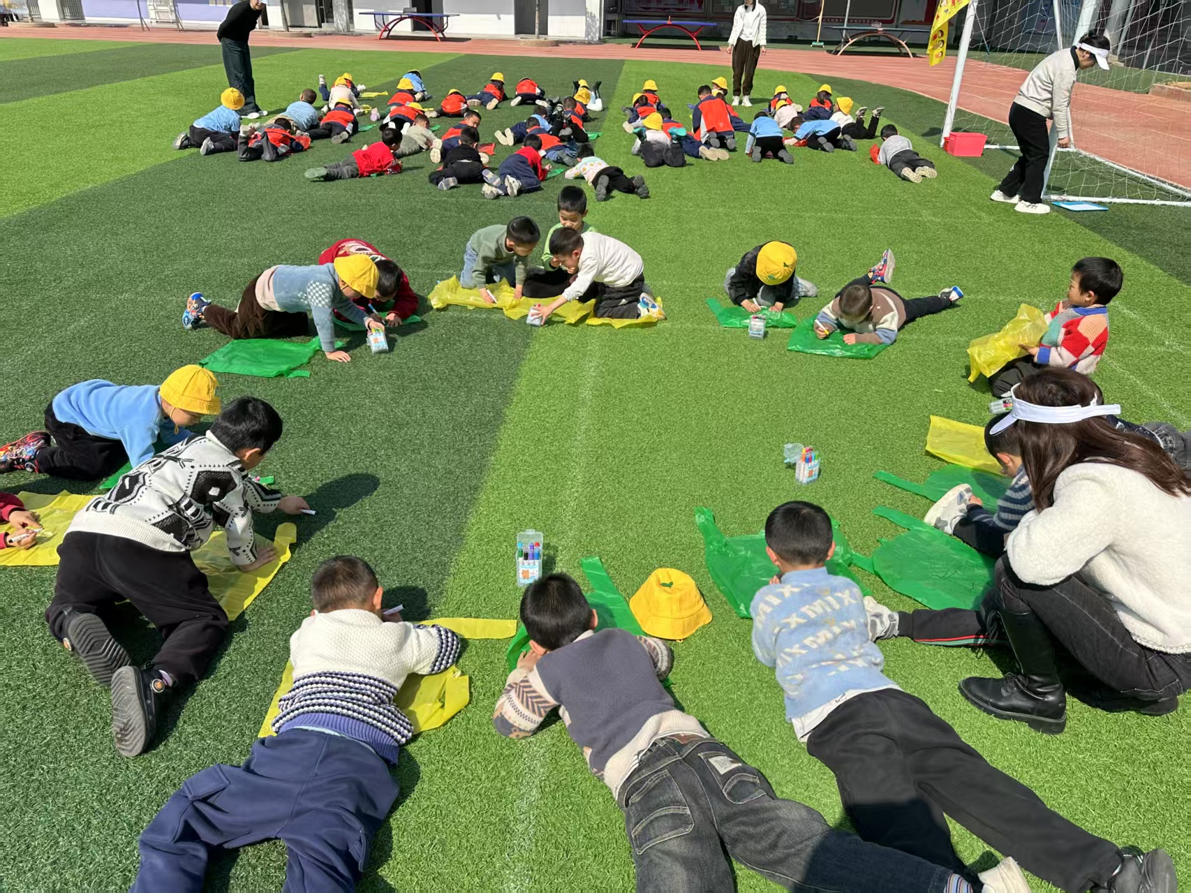大班的活动“把春天‘带’回家”充满创意与趣味。孩子们和家长、老师们一起收集彩色塑料袋,然后用画笔、彩纸、纽扣等材料,精心装饰彩袋。他们将自己心中的春天绘制在彩袋上,有的画了盛开的桃花,有的画了飞舞的蝴蝶,还有的画了放风筝的小朋友。随后,孩子们带着装满春天的彩袋,在校园里寻找春天的足迹,将春天的美好永远珍藏。
