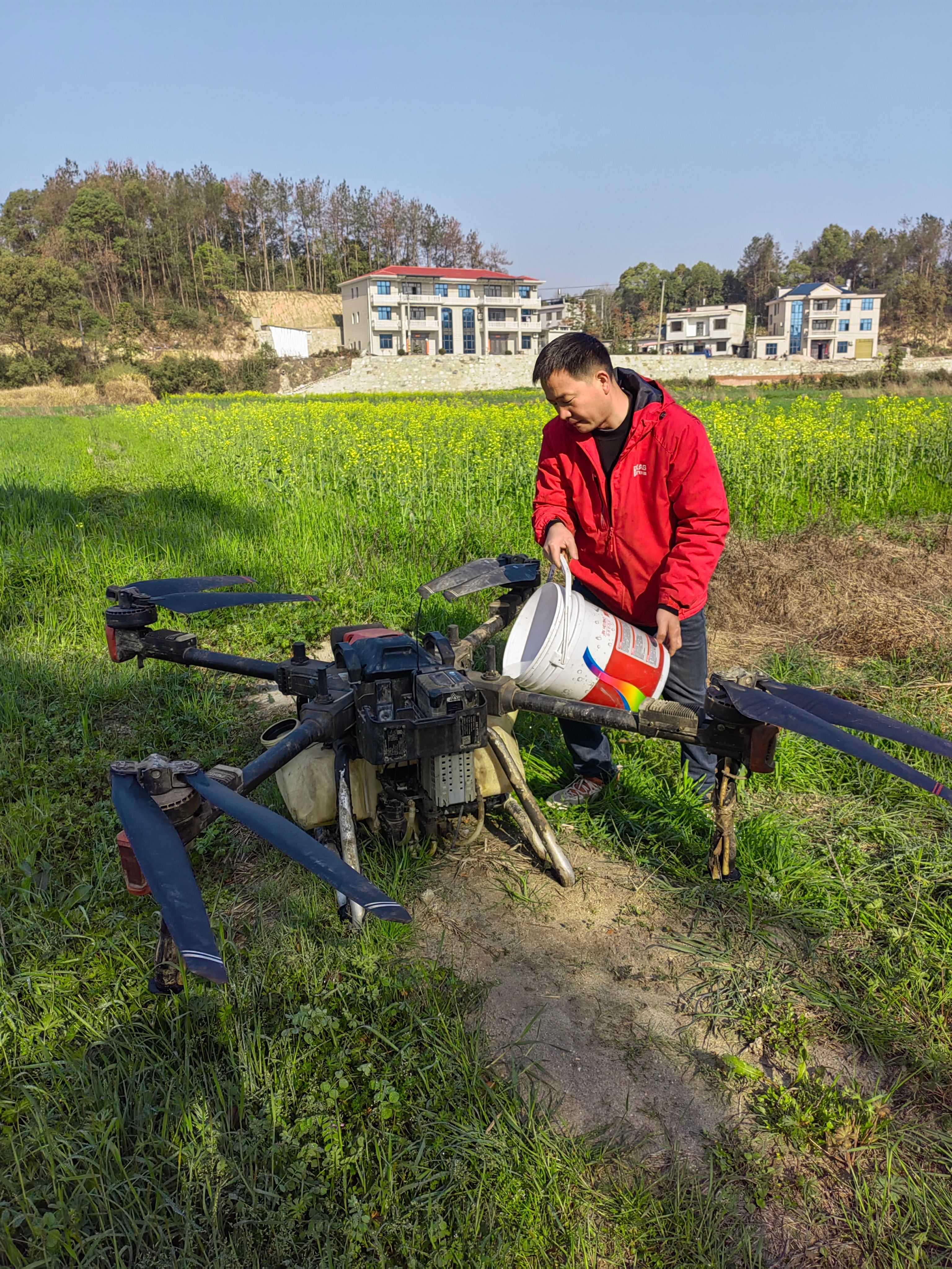 3月19日上午,伴随着一阵阵旋翼转动声,无人机腾空而起,机翼掠过之处,农作物被细密的农药雾滴全面覆盖。根据小麦和油菜的不同特点,分别喷洒叶面肥预防小麦锈病,喷洒硼肥预防油菜菌核病。只见农技人员熟练地装药、起飞、悬停、匀速飞行,然后喷洒机身下的喷淋头喷出白色的雾化农药,为一片片农作物披上了“防护衣”。