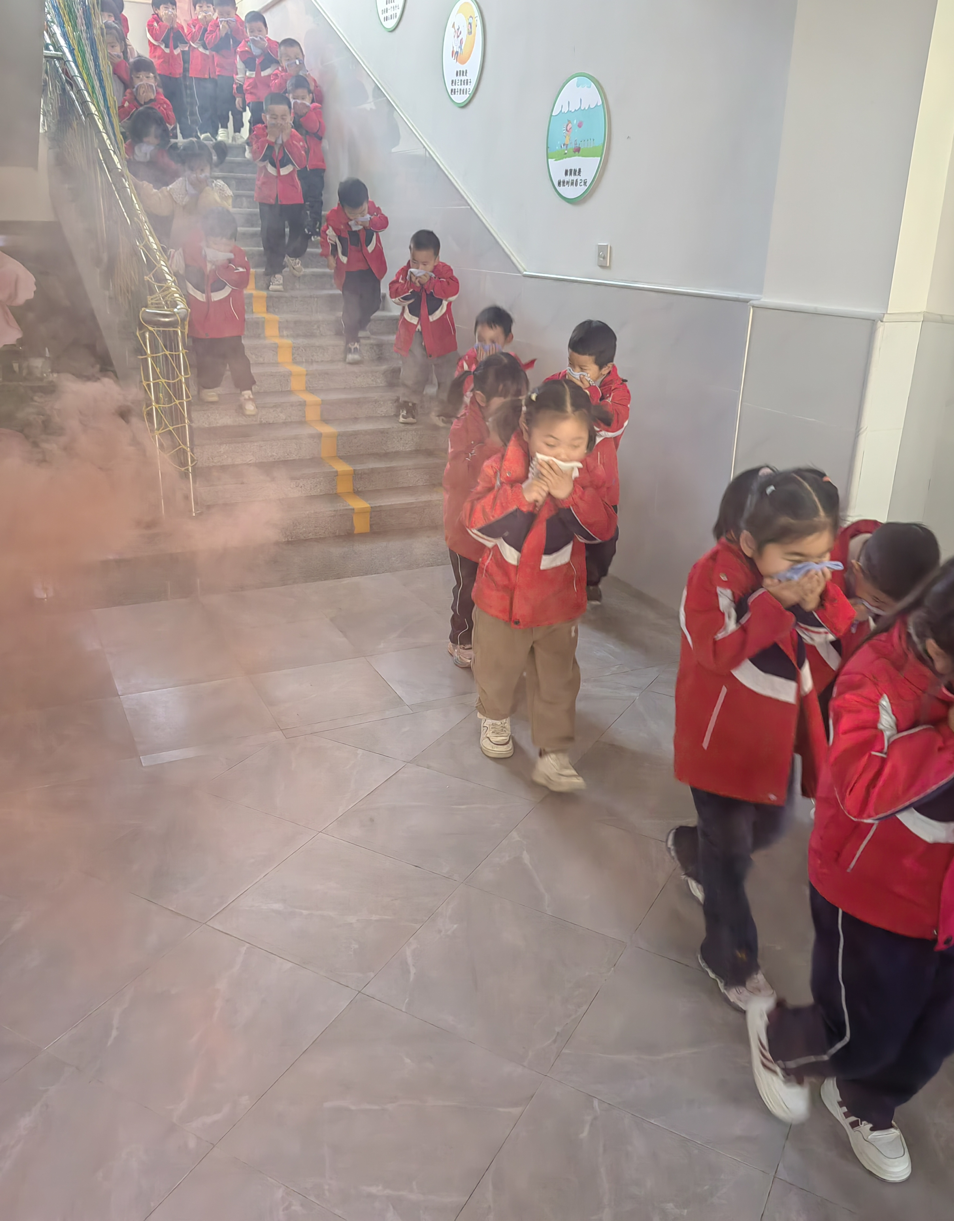 活动中,各班教师根据幼儿年龄特点,通过视频、PPT等方式开展消防安全知识主题教育,让幼儿明白如何在火灾中冷静面对、掌握正确的逃生方式。活动中,总指挥一声令下,随着紧急警报的响起,各班老师沉着、冷静地引导班级幼儿用湿毛巾捂住口鼻,从安全出口沿疏散通道撤离到安全地点,各班教师及时清点人数并汇报,历时不足4分钟,演习活动紧张有序、顺利完成。随后,保安对正确使用消防栓和灭火器的方法进行了讲解及演练,并让教师和孩子上台进行实操,手把手地教他们学会了灭火器的使用方法。