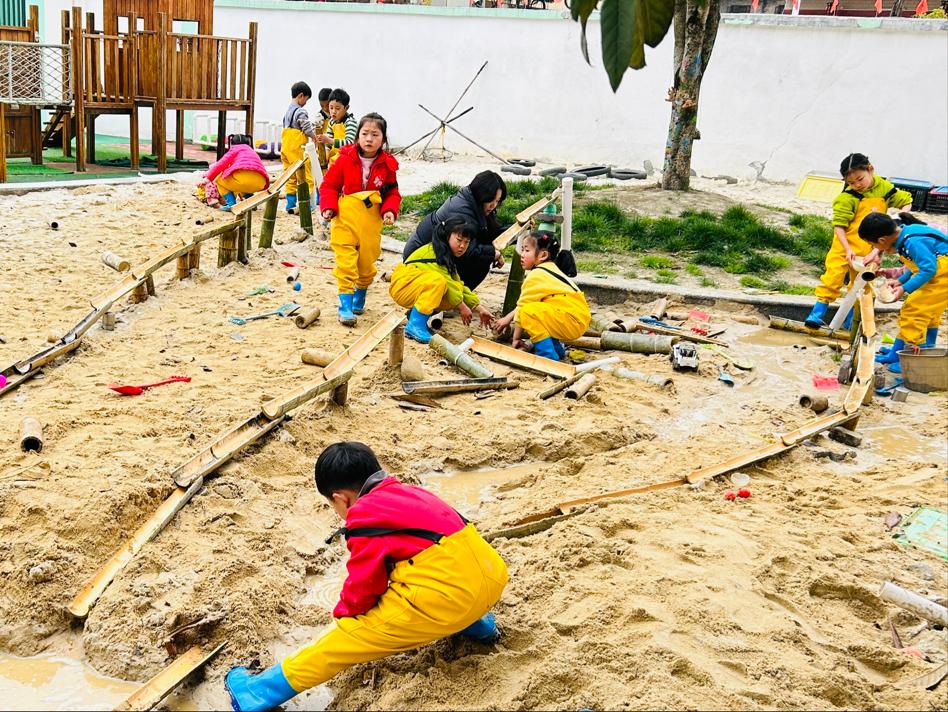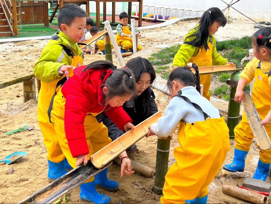 阳光下,孩子们三五成群地围在沙水池里,有的手拿小铲子挖“河道”,有的忙着拼接长短不一的竹筒,还有的正在测试水流方向。“老师快看!我们的水渠通水啦!”随着一声欢呼,清澈的水流顺着竹筒搭建的“高架渠”欢快地流淌,孩子们的脸上绽放出自豪的笑容。