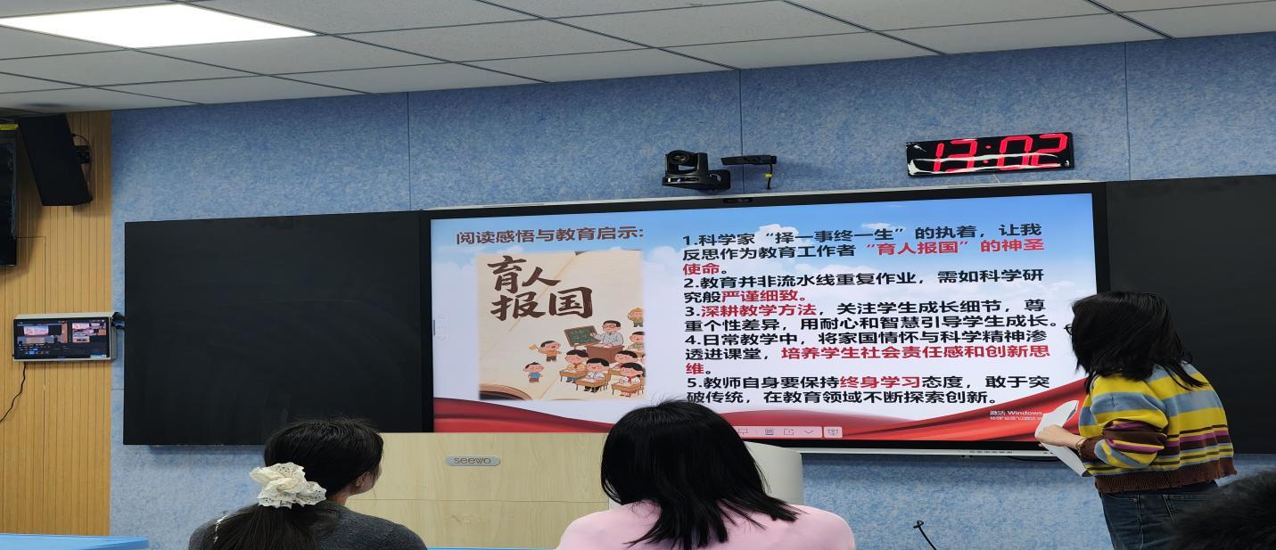 分享之初,道德与法治学科刘老师分享的书籍是《国之脊梁》,她分析了从科学家到革命家,从艺术家到教育家,每一个名字背后都是不朽的传奇。刘老师结合书中人物精神与自己教学实践相结合,提醒我们不忘教育初心,牢记育人使命。