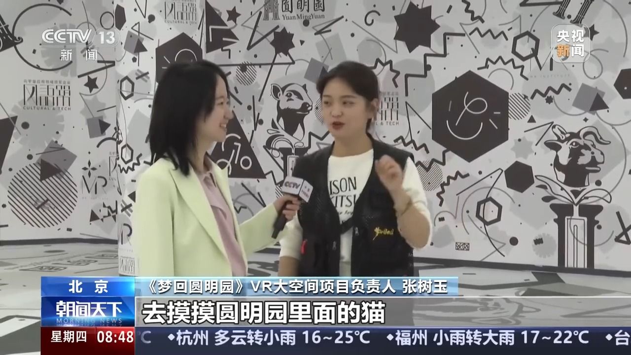 《梦回圆明园》VR大空间项目负责人 张树玉:其实它更像是一种行进式的电影院,我们其实就可以将很多故事内容跟互动去做一些结合,所以小朋友可以在里面引蝶,去摸摸圆明园里面的猫,包括在买卖街里面,你可以掀开包子铺的笼盖,看到热气腾腾的包子。
