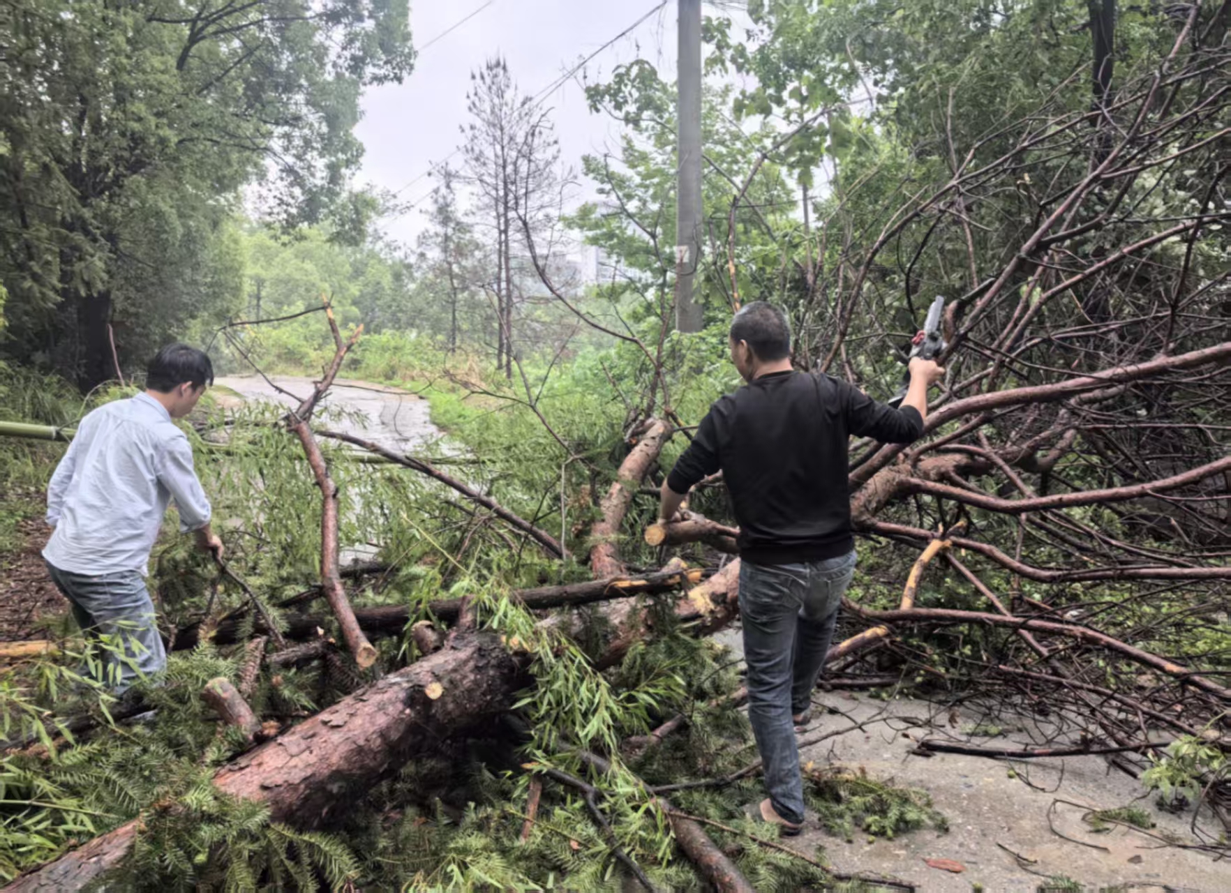 在3组路段,巡查人员发现一棵大树被狂风刮倒,横卧在路中央,更为严重的是,倒伏的树木周围电线错综复杂,一旦发生漏电等意外情况,后果不堪设想。面对这一紧急情况,社区干部们迅速行动起来,第一时间联系电力部门前来处理。电力部门排除安全隐患后,中心户长李超主动从家里拿来锯子,与社区工作人员一起对倒伏树木进行锯断清理。大家分工明确,有的负责锯树,有的负责搬运树枝,有的负责清理地面上的枝叶和淤泥。在众人的齐心协力下,原本被阻断的道路很快恢复了畅通。