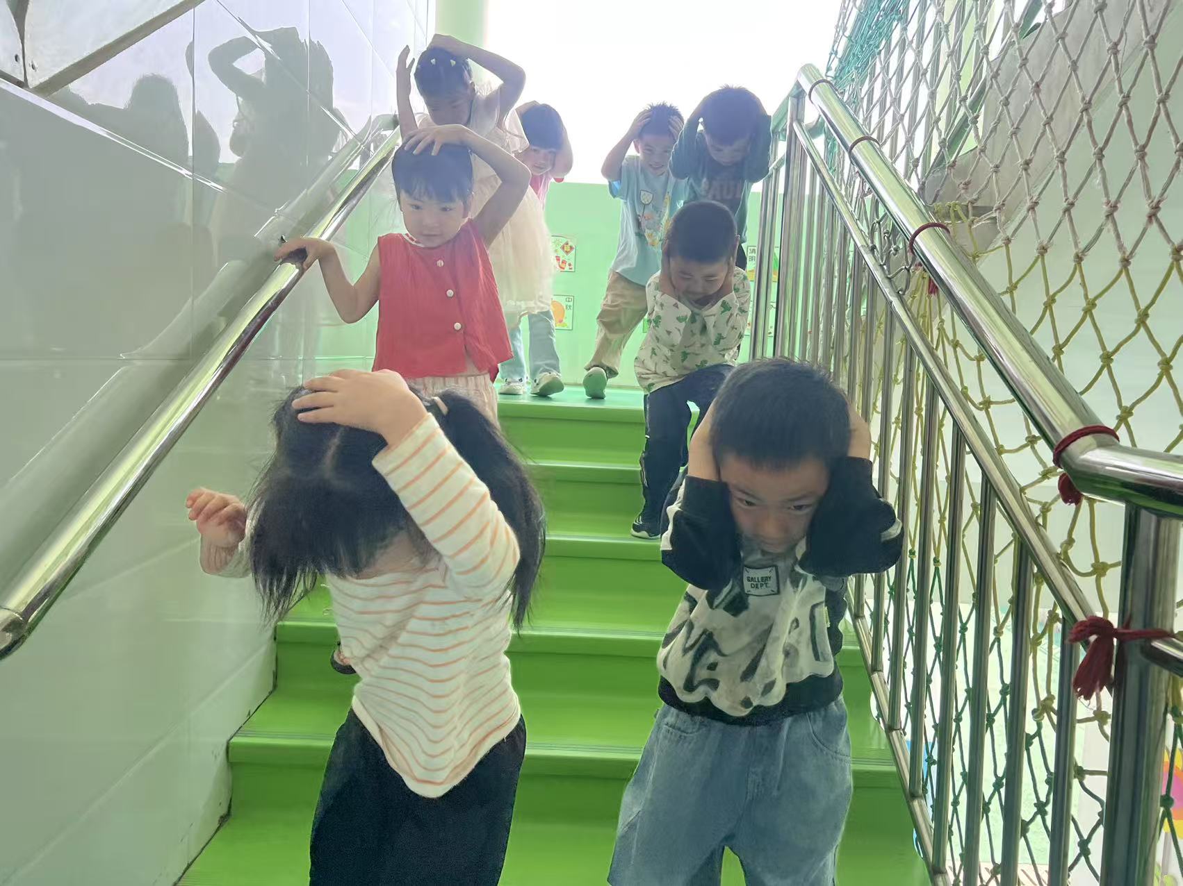 随着第一次警报声的响起,防震演练正式开始,孩子们立刻停止一切活动,在老师的组织下,蜷缩身体、降低重心、双手护头,就近躲到墙角、桌下等或支撑结构较多的空间,进行紧急避险。当第二次警报声再次响起,班级老师迅速组织幼儿双手护头,弯腰,按照逃生路线快速有序地紧急撤离到安全空旷区域。各岗位教师也在疏散过程中,时刻监控幼儿秩序。到达指定安全区域后,各班教师立即清点人数,检查是否有受伤幼儿,安抚幼儿情绪,并立刻向总指挥报告,确保每一位幼儿安全。