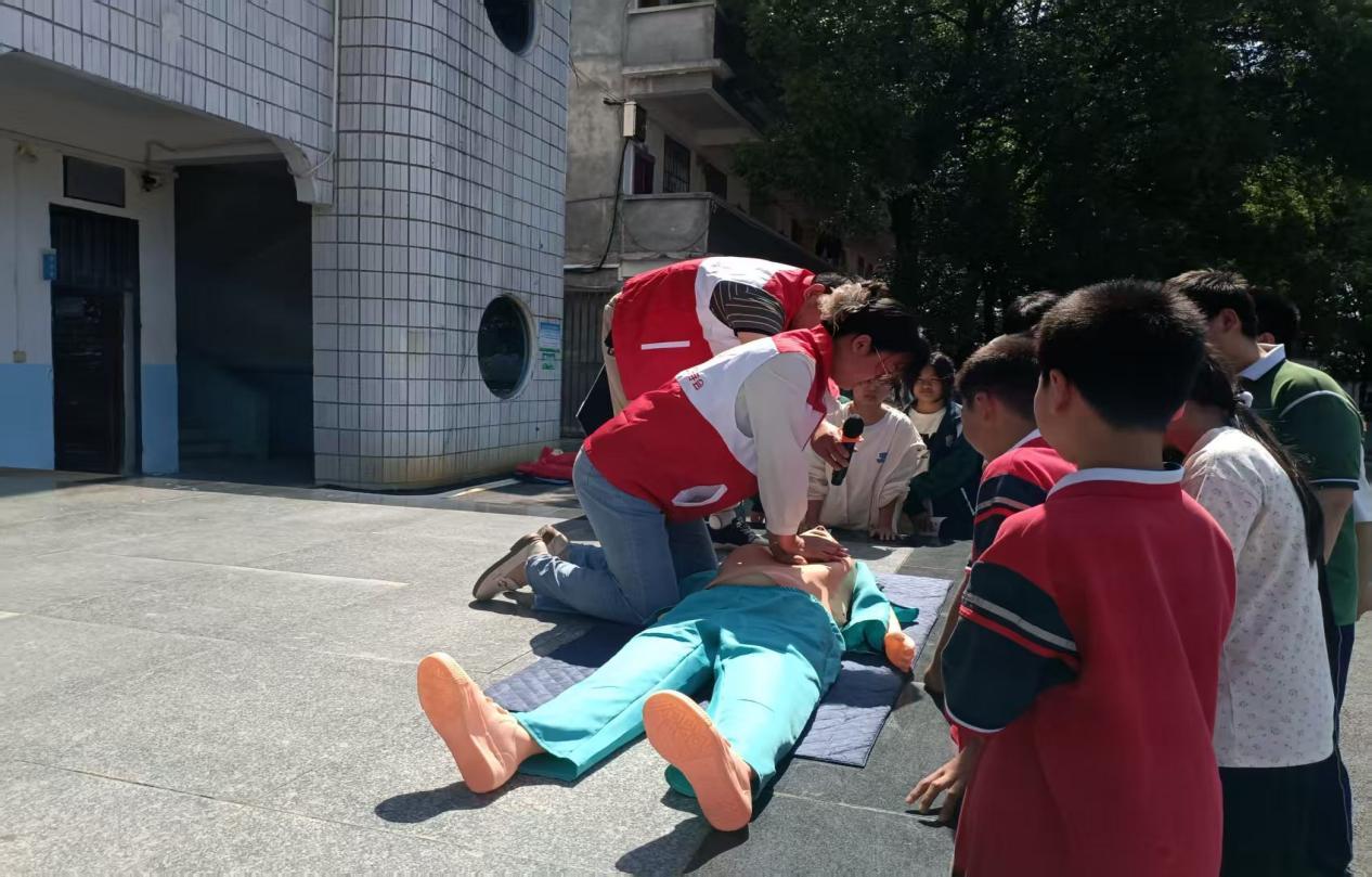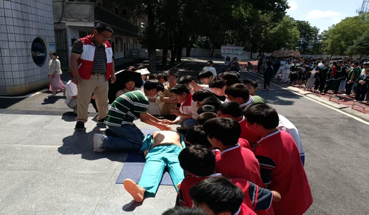 沙堆中学师生代表积极上台进行实际操作并参与模拟演练,学习自救、互救、他救的方法,有效提高了师生们预防溺水、应对紧急情况时的心肺复苏应急救治能力。