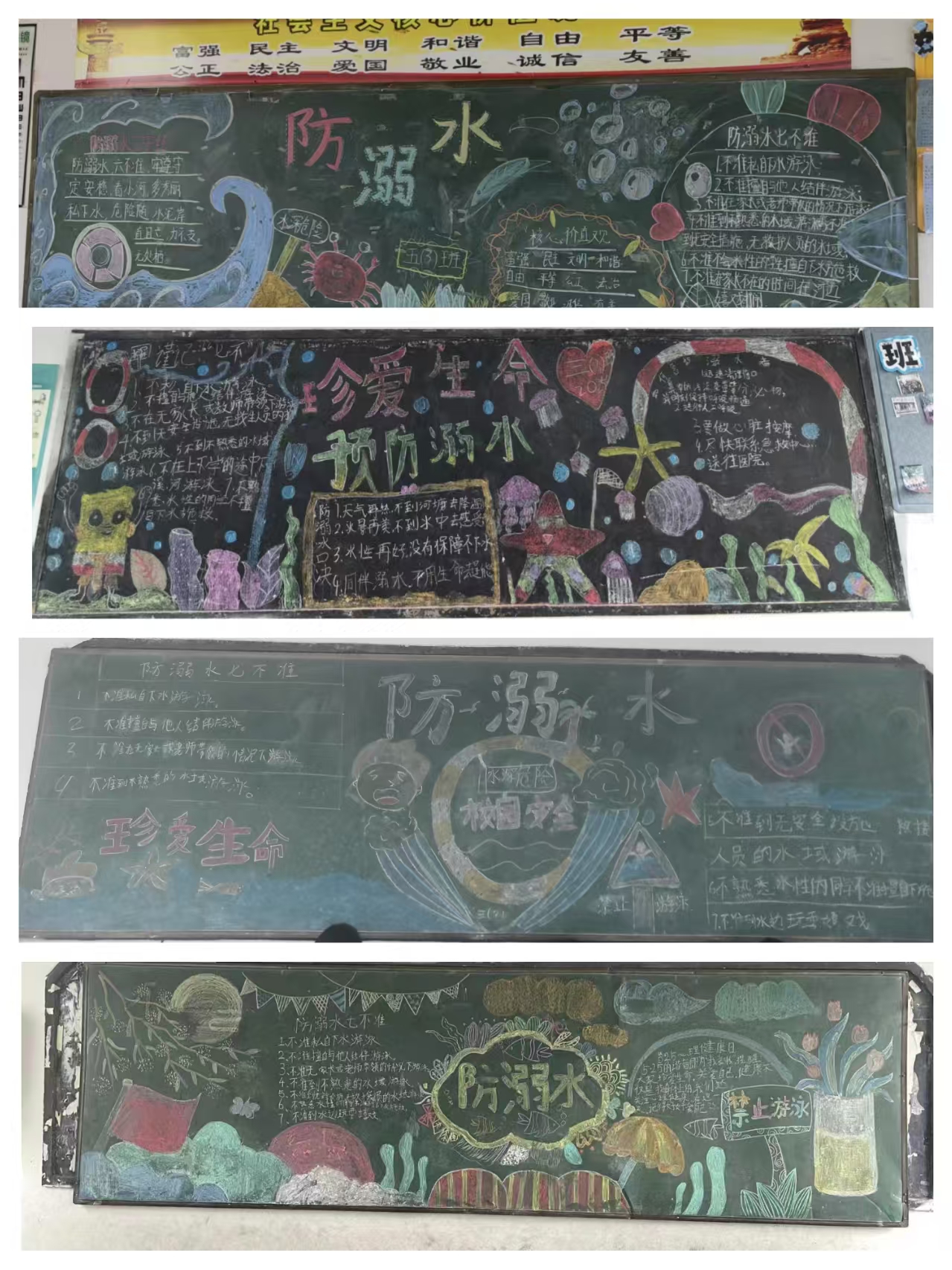 绷紧安全弦,共筑防溺墙。在主题班会课上,各班主任以“珍爱生命,预防溺水”为主题,为同学们上了一节生动且深刻的主题班会课。组织学生观看防溺水警示影片,引导学生对案例进行讨论,让学生们在交流中反思,在反思中提高警惕。此外,通过防溺水黑板报、防溺水手抄报、组织全校学生背诵防溺水七不准等形式,确保学生们真正将防溺水知识牢记于心。