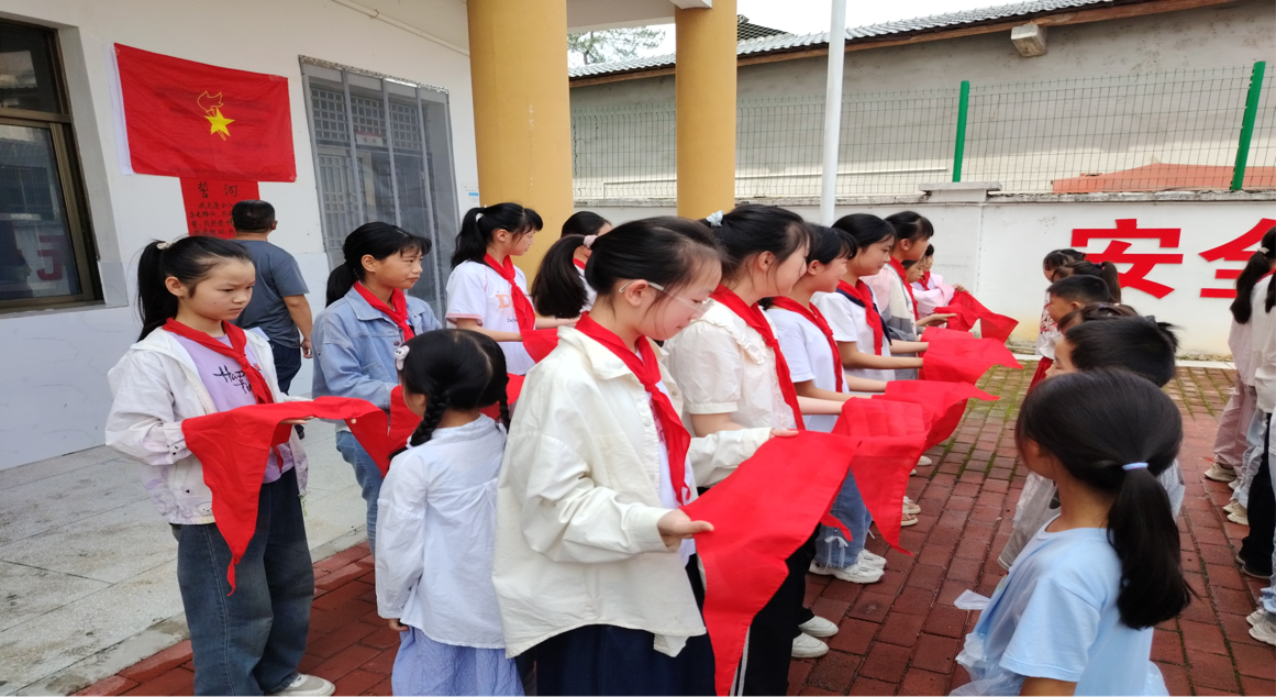 红领巾在阳光下泛起光芒,新队员们笔直的身影与飘扬的队旗构成最美的画面。授巾环节,高年级队员手捧红领巾,传递传承火炬。新队员郑重接过红领巾、披于肩头,胸前飘动的红三角,似火焰般点燃使命感。