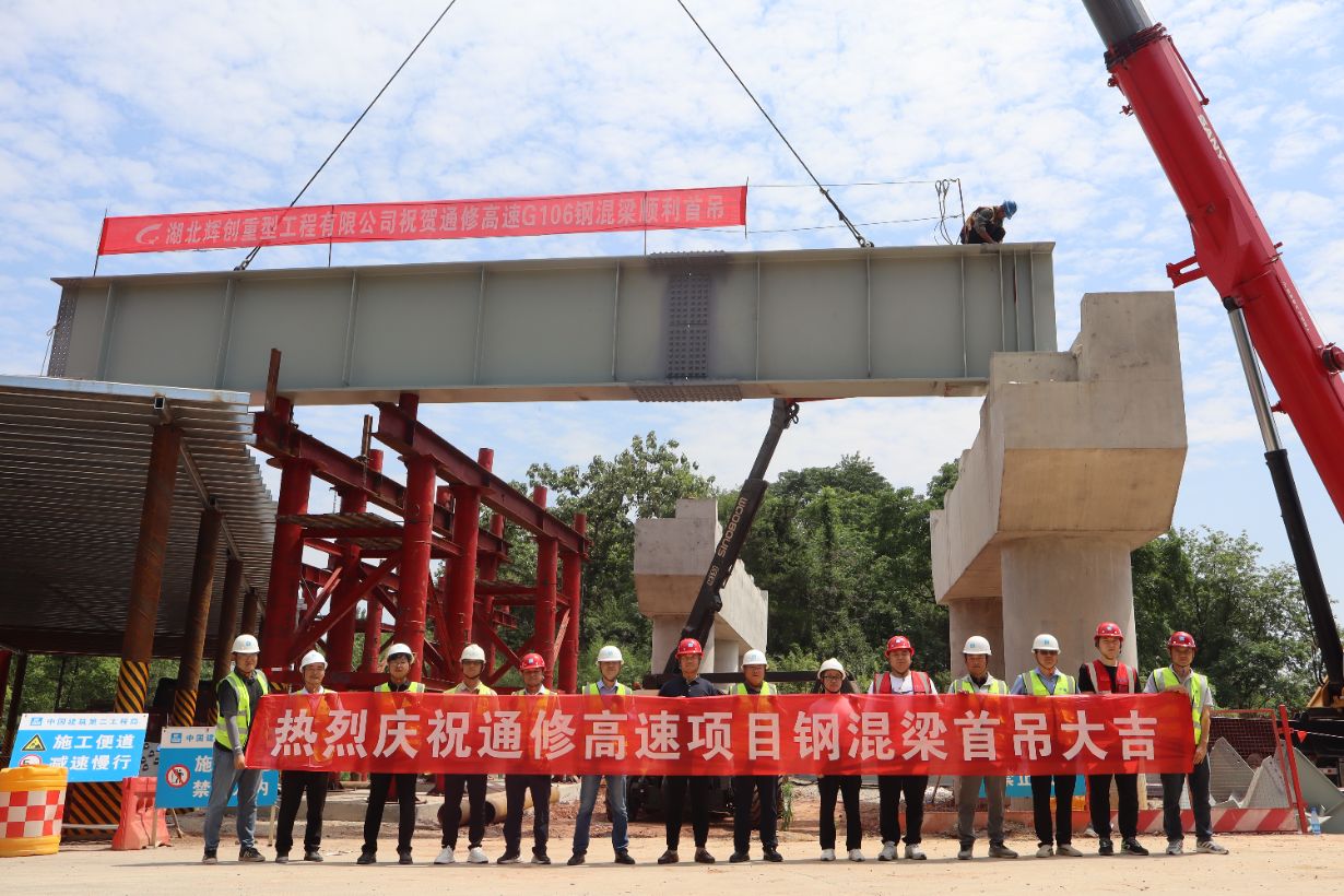 【通讯员 徐颖 张柱】6月5日,随着首节14米长、16吨重的钢混梁节段平稳吊放至桥墩临时支座上,中建二局通修高速公路第二标段项目G106跨线桥首节钢梁安装顺利完成,拉开了项目桥梁上部结构施工的新篇章。