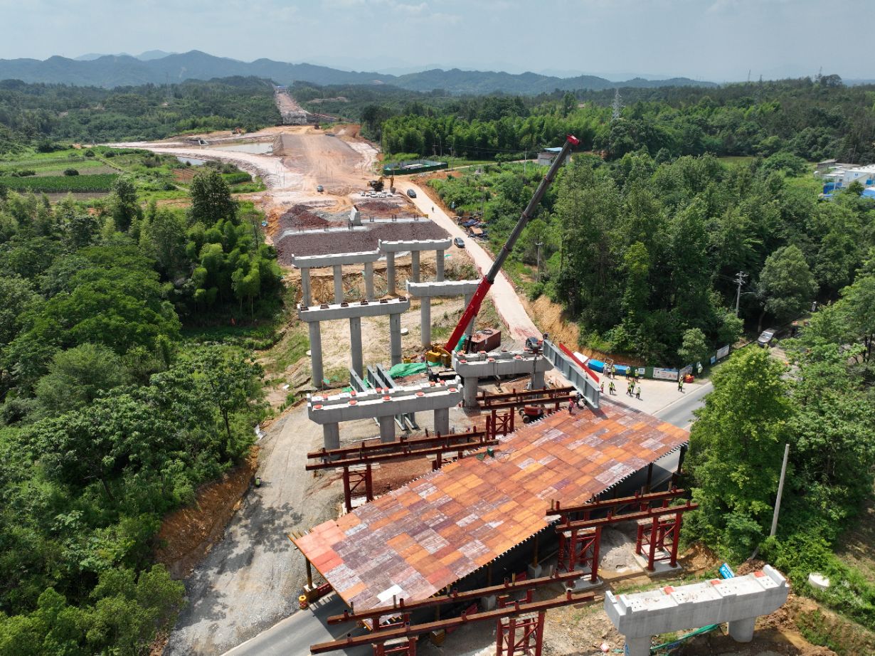 作为通修高速公路第二标段关键性节点工程,G106跨线桥首联钢混梁全长40米,总重量223.5吨,采用分段焊接、分段吊装施工方法。在保证G106国道正常通行条件下,为成功完成吊装作业,项目团队创新采用“智能监测+液压调节”技术,通过BIM模型与实景模型融合技术模拟现场吊装环境,结合北斗定位系统实时监控梁体姿态,确保毫米级精度对接。同时,现场配备智能监控系统,实现提前预警桥下交通流量,便于选择车辆较少时间段进行施工,结合传统人工保通不仅缩短工期15%,也有效确保了施工安全。