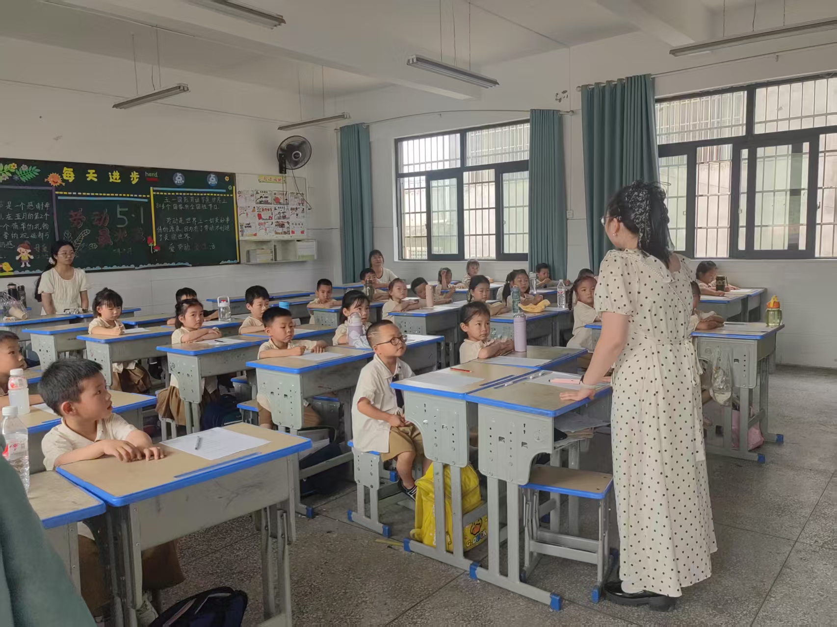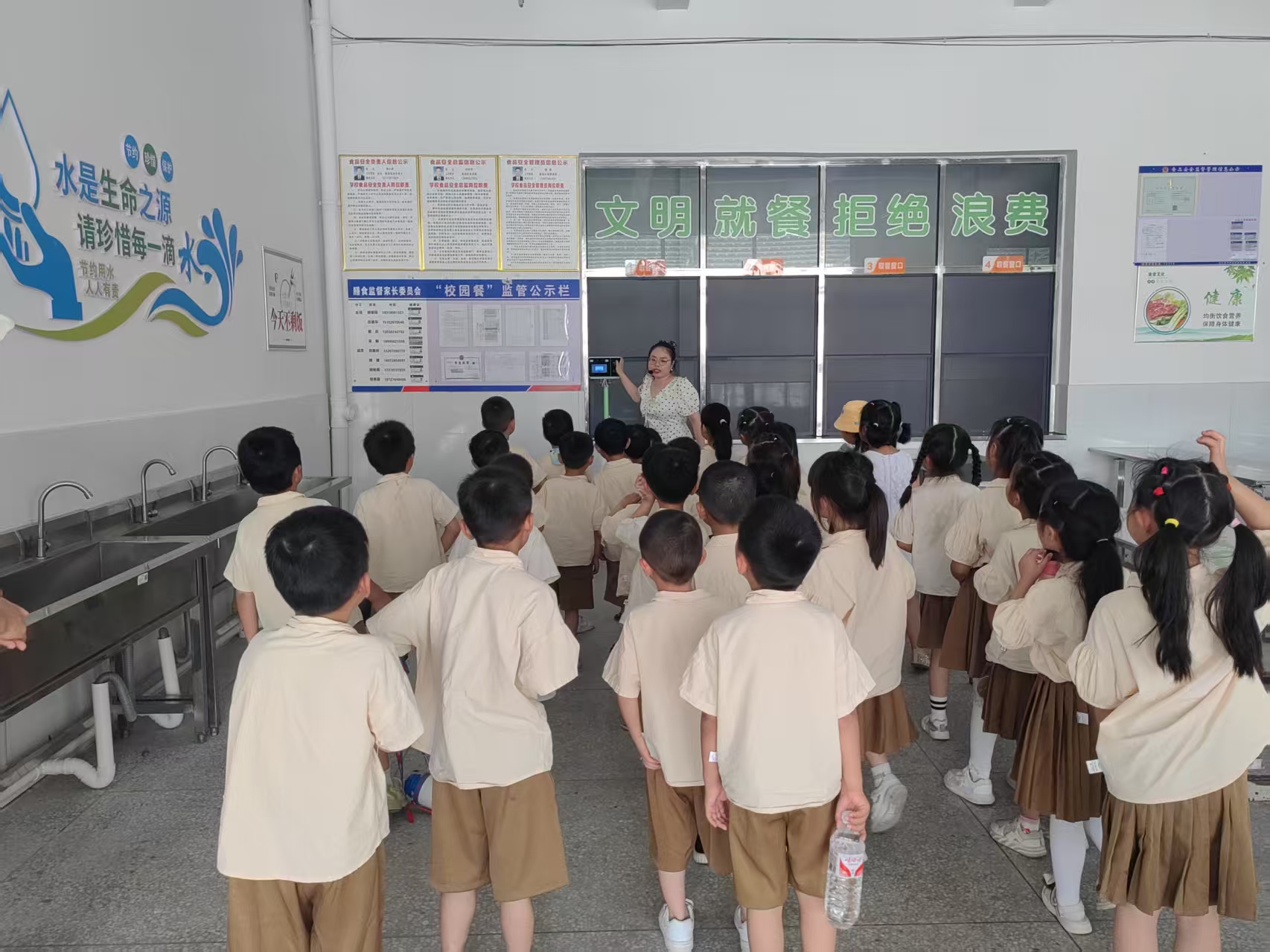 抵达小学后,一年级班主任徐文老师热情地迎接孩子们,并带领他们参观小学环境。从宽敞明亮的教室、功能齐全的功能室,到充满活力的运动场、干净整洁的食堂和厕所等主要活动场所,徐老师细致入微地讲解,让孩子们对小学的学习生活空间有了清晰认知。