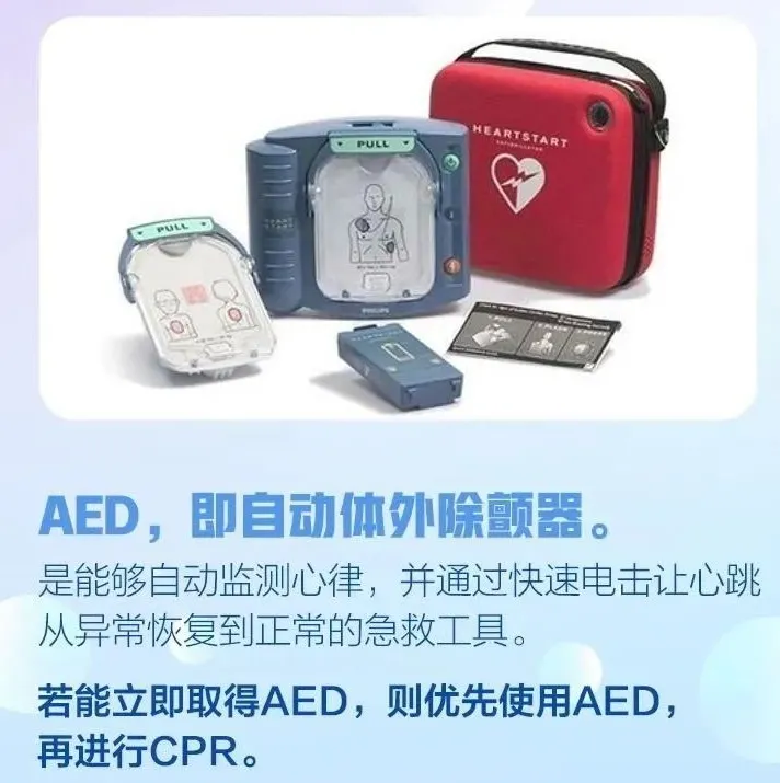 AED操作简单且附有简明易懂的操作指南但需要强调一下在使用AED时必须维持胸外按压直到AED提示停止按压为止!来看如何使用?01打开电源(维持胸外按压) 打开AED机器的电源开关,一切操作都会配有语音提示,多数型号AED可选择中英双语。02贴上电极贴片(维持胸外按压) 打开盖子,取出电极片。脱下患者衣物,使胸部裸露。让患者仰面平躺,按要求正确粘贴电极片。(前侧位或者前后位。)03准备电击(停止胸外按压) AED在心律分析之前要求离开患者一段距离,仪器将提示“正在分析”病人的心率,确定是不是室颤状态。如果需要除颤,AED会提示自动充电(一般是5—15秒),并提示充电完成,电击按钮会有闪烁。分析完成后,AED若提示建议电击,立即提醒所有人不要与患者接触(不然就要触电啦),随后按下电击按钮。04重复操作(继续胸外按压) AED分析后如果不建议电击,则继续胸外按压。注意!机器每2分钟会自动分析心律,按提示音重复操作。整个过程不能将电极片撕下。希望有更多市民掌握AED的使用关键时刻挽救身边人的生命。