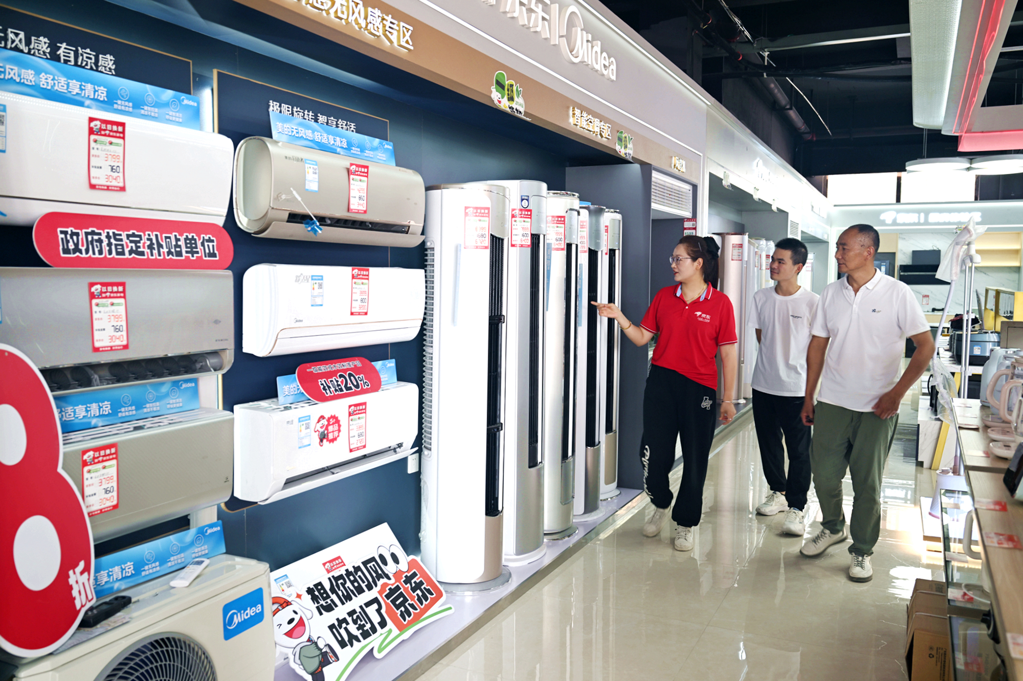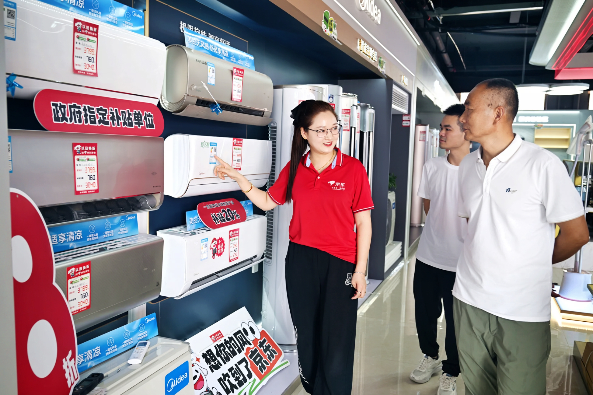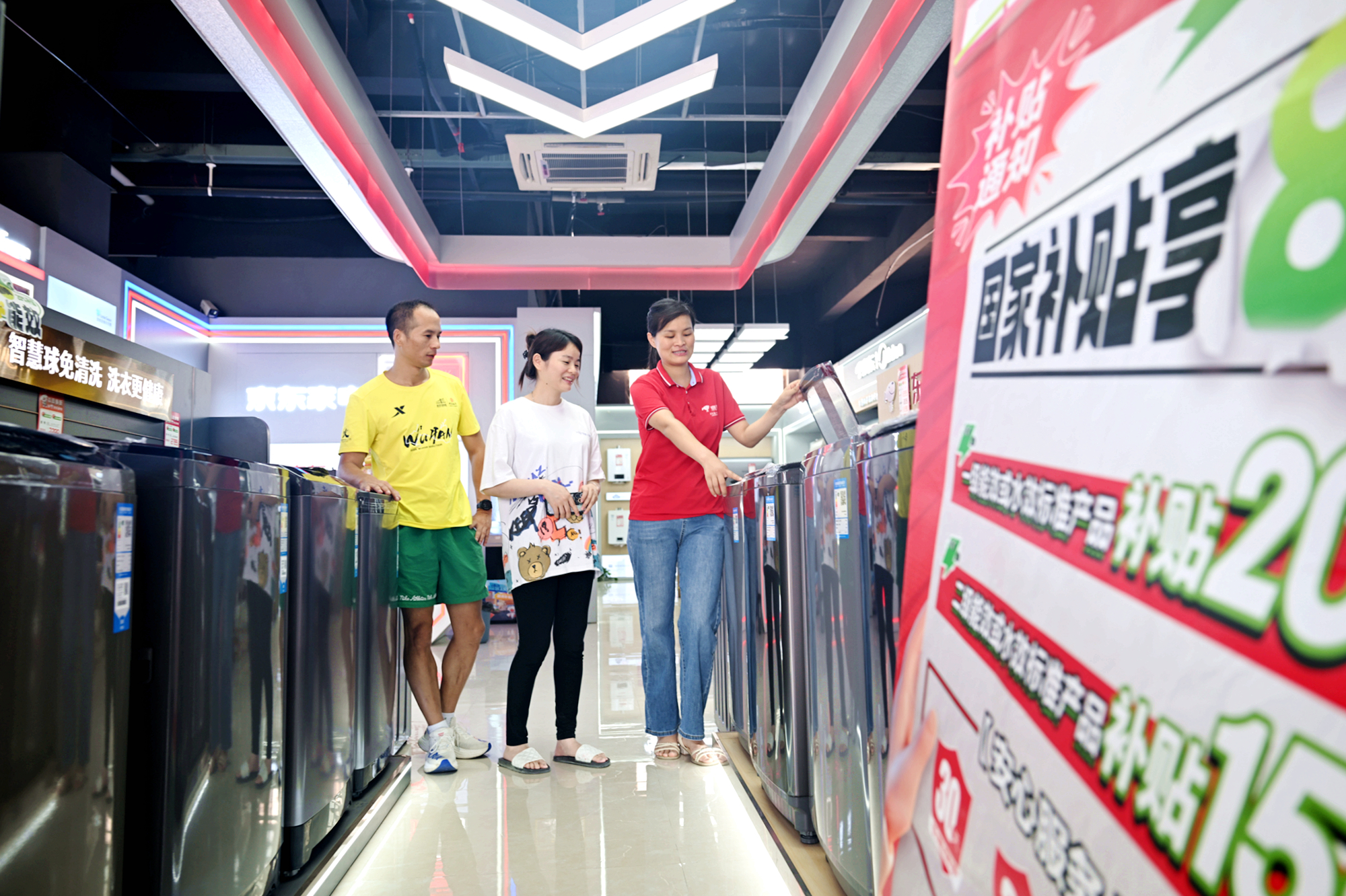 6月17日,市民在湖北省咸宁市通城县万雅京东家电专卖店挑选家用电器。