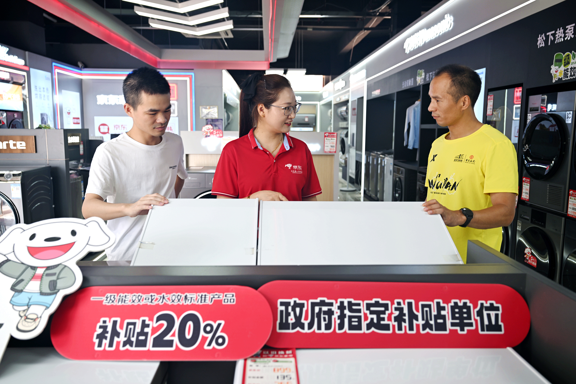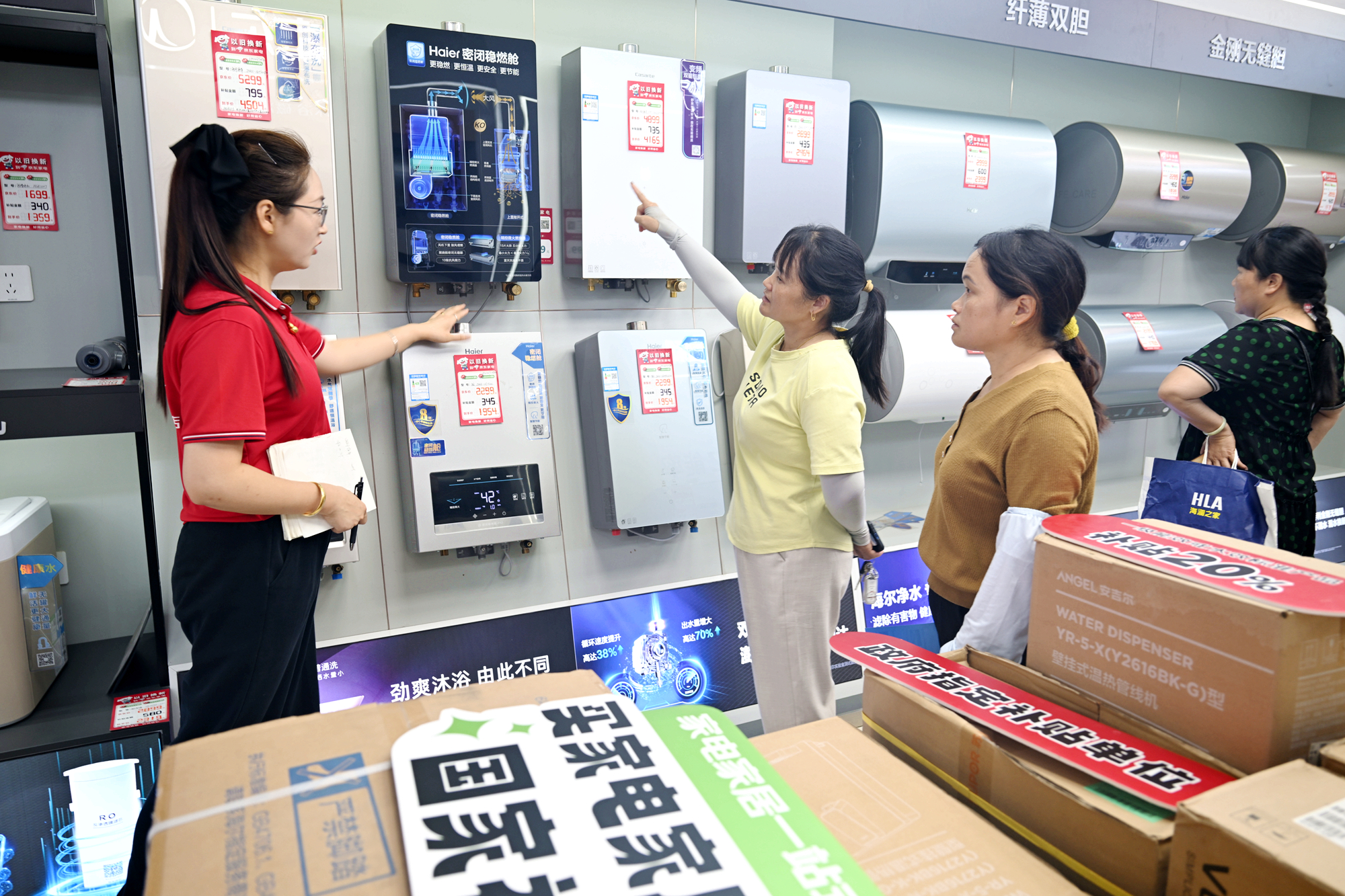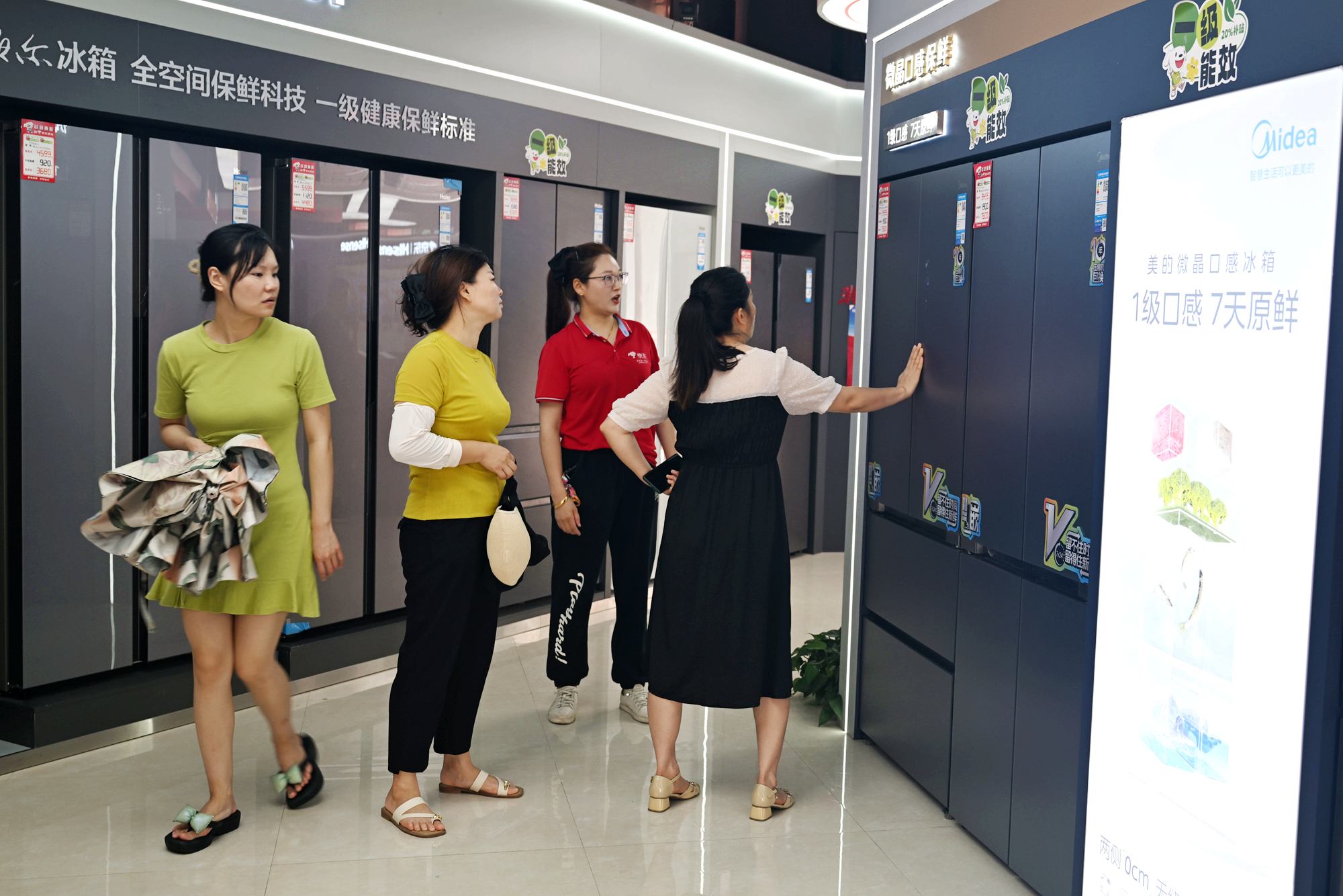 6月17日,市民在湖北省咸宁市通城县万雅京东家电专卖店挑选家用电器。