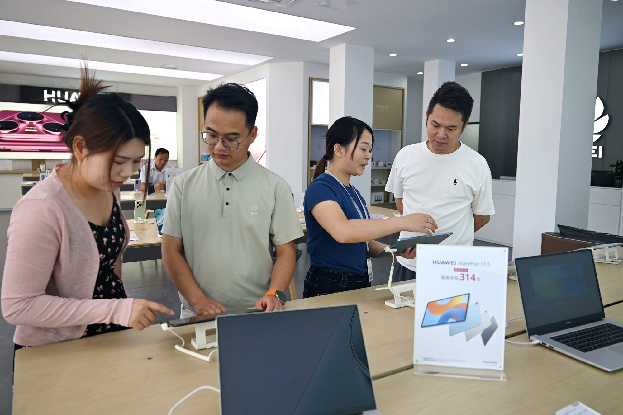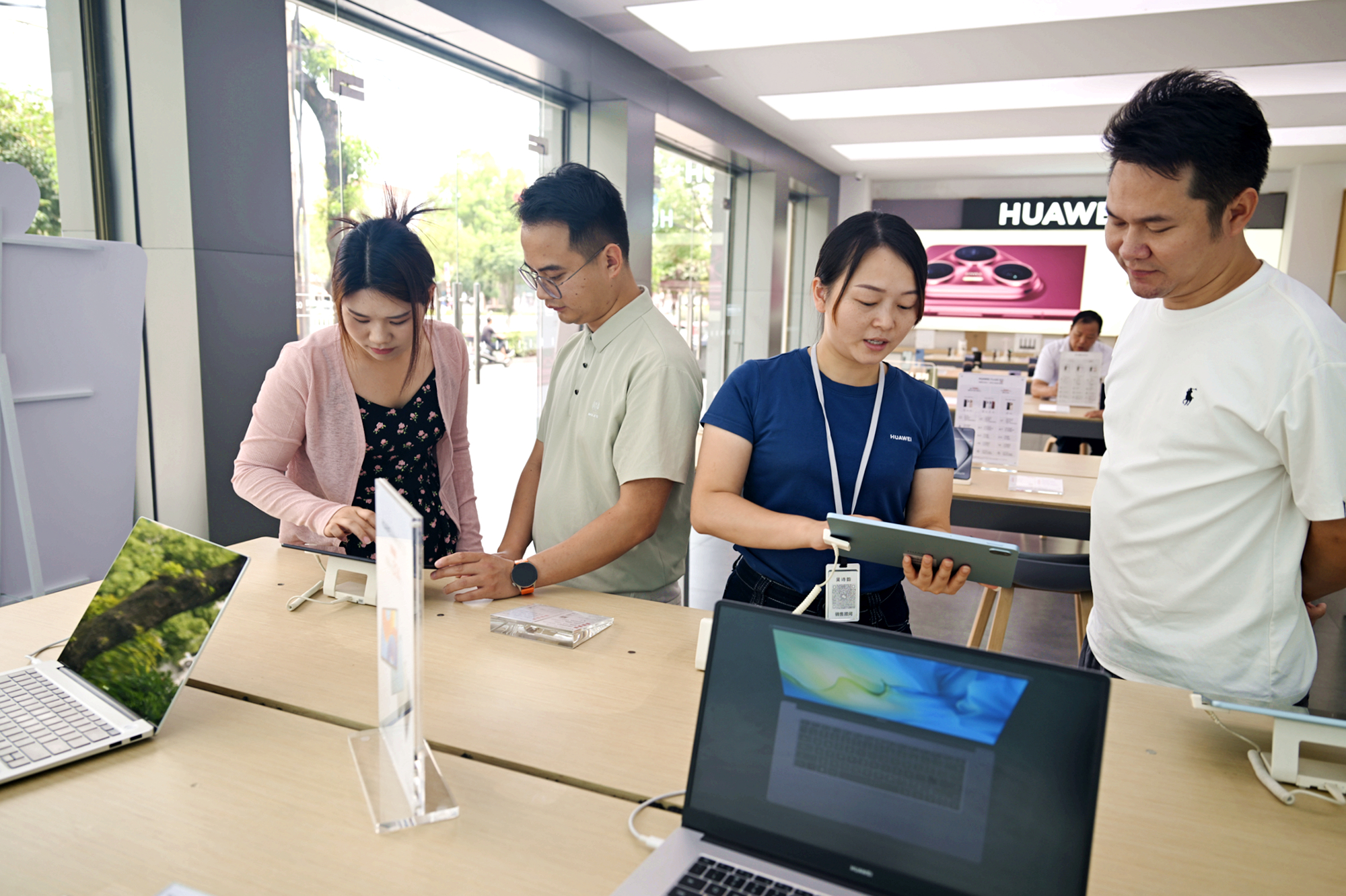 市民在湖北省咸宁市通城县隽水大道华为商店选购电脑和手机。