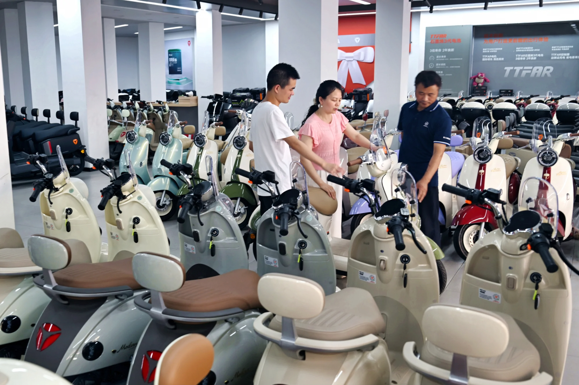 在湖北省咸宁市通城县民主路一电动车专卖店,顾客在挑选电动车。