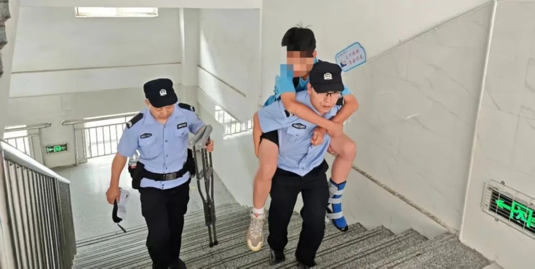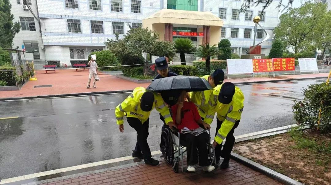 中考期间,治安大队、反恐怖和巡特警大队的执勤民辅警主动帮助因受伤而行动不便的考生安全抵达考场。