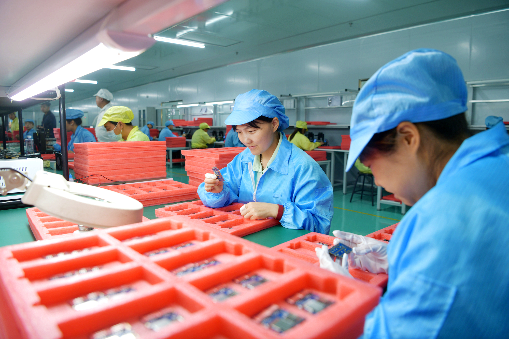 2025年7月2日,在咸宁市通城县电子信息产业园湖北兴之通电子科技有限责任公司半导体封测车间,自动化贴片机高速运转,工人正紧张进行产品测试和组装。