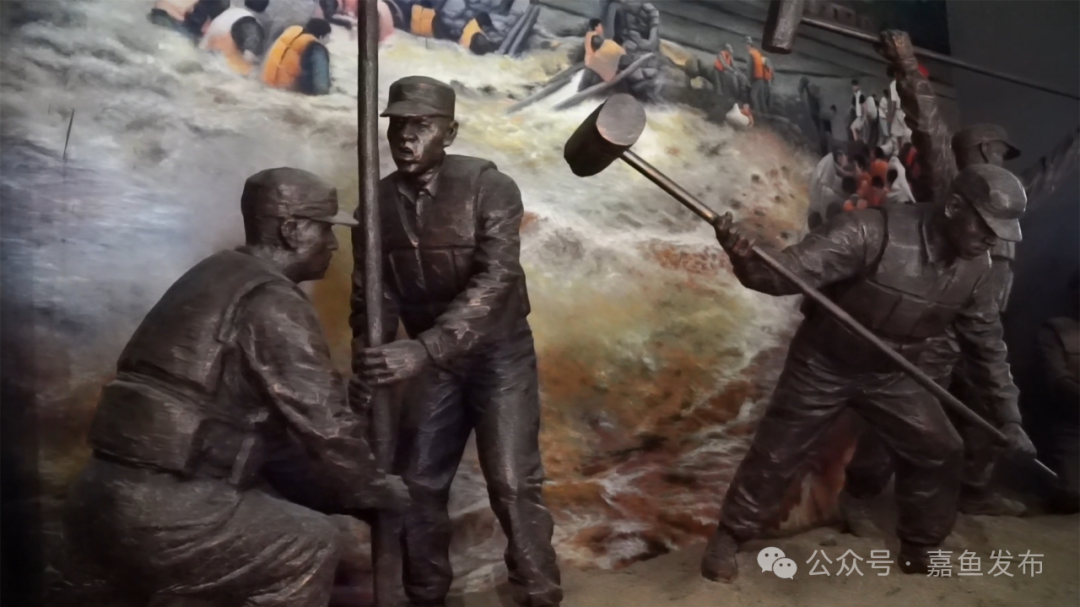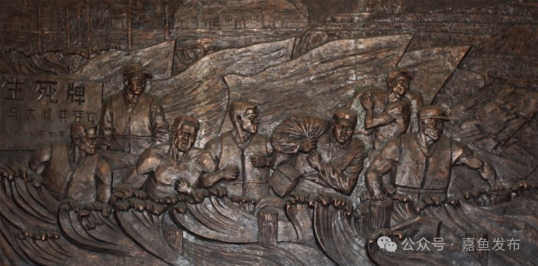 大厅里,满壁的浮雕映现出1998年夏天,军民团结一心抗击洪水的英勇景象。浮雕上的生死牌写着:誓与大堤共存亡!